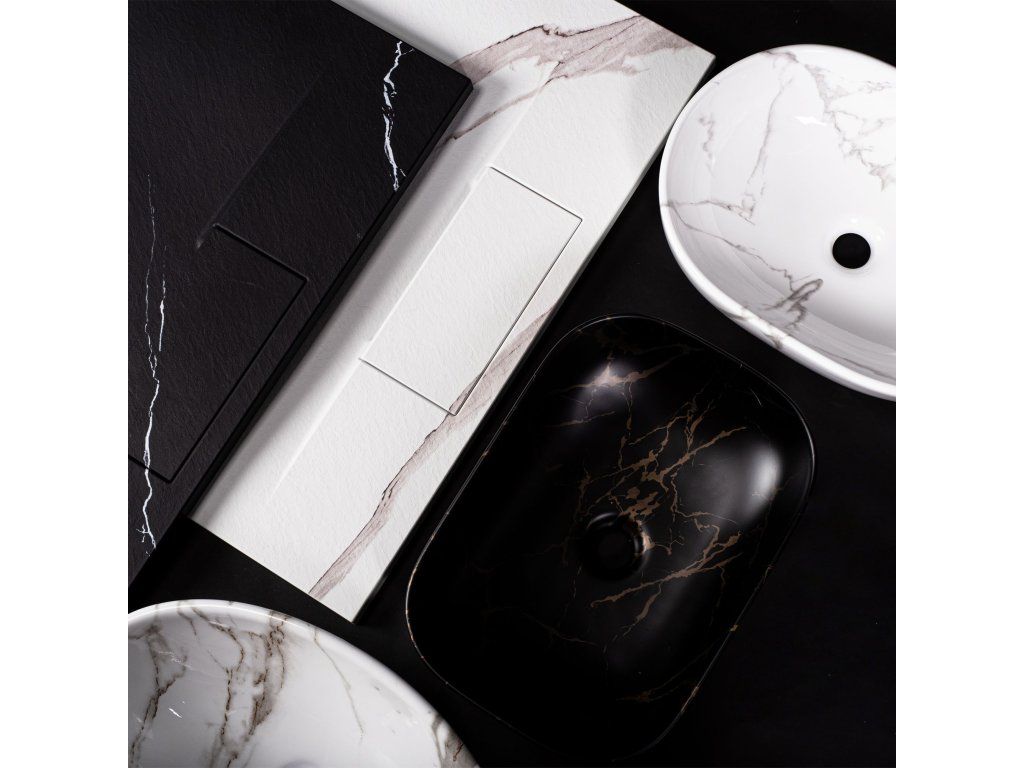 Umyvadlo v bílém lesklém provedení s mramorovým efektem se navíc díky speciální fázi výroby snadno čistí, je velice odolné a má svůj jedinečný vzor.