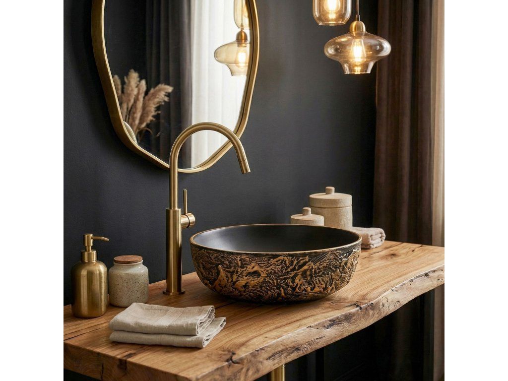 Vneste do své koupelny nádech luxusu s kulatým umyvadlem na desku Rea Babilon Gold. Tento unikátní keramický model zaujme neuvěřitelným kontrastem – syrovým, vyřezávaným pláštěm a dokonale hladkým, minimalistickým vnitřkem.Výrazná černo-zlatá vnější textura – vnější strana mísy přitahuje pohled hlubokým, nepravidelným drážkováním. Oděrky v barvě antického zlata na černém pozadí vytvářejí trojrozměrný efekt.Hladký, matně černý vnitřek – v efektním kontrastu k syrovému plášti je vnitřek umyvadla dokonale hladký a vyvedený v hluboké matné černé barvě.Vysokokvalitní keramika – vyrobení z pevné sanitární keramiky zaručuje dlouholetou odolnost. Hladký vnitřek zajišťuje, že se umyvadlo i přes bohatou vnější texturu snadno udržuje v čistotě a voda může volně odtékat.Montáž na desku – umyvadlo ve tvaru klasické mísy je přizpůsobeno k postavení na desku nebo skříňku, což umožňuje plně vyniknout jeho šperkovému, sochařskému charakteru v prostoru koupelny.Keramické umyvadlo Babilon Gold bude skvělou volbou pro odvážné interiéry v industriálním stylu, glamour nebo modern dark, kde se stane výrazným a luxusním centrálním bodem Vaší mycí zóny.