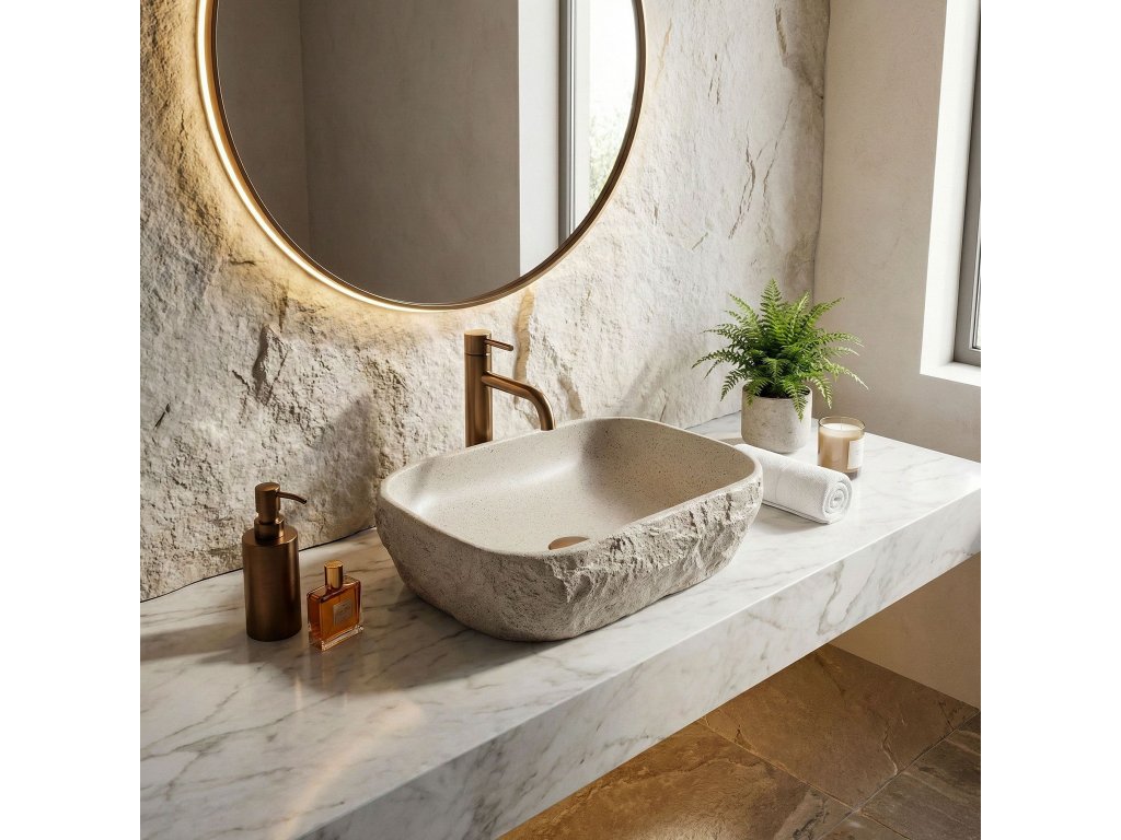 Objevte jedinečné spojení přírody a moderního stylu ve své koupelně díky umyvadlu na desku Rea Bianka v provedení světlá béžová. Tato výjimečná volba je určena pro ty, kteří chtějí do interiéru vnést nádech luxusu a originálního stylu.Naše umyvadla na desku nabízejí řadu výhod:Vnější struktura kamene – dodává koupelně prestižní vzhled.Hladký vnitřní povrch – umožňuje rychlé čištění.Saténová povrchová úprava – přidává eleganci.Unikátní barevnost – světle béžový odstín s tmavšími detaily maskuje drobné usazeniny.Optimální střední velikost – ideální pro každodenní používání.Umyvadlo Rea Bianka spojuje komfort s moderním designem.