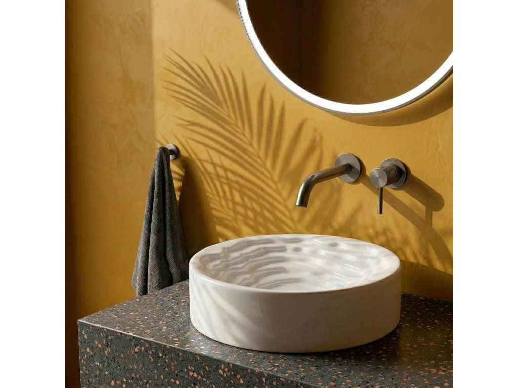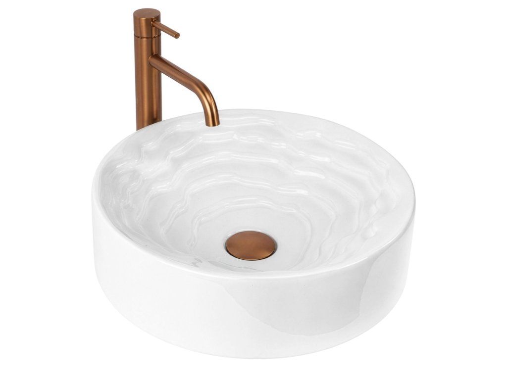 Objevte nový rozměr designu ve své koupelně s kulatým umyvadlem na desku Rea Calla. Tento keramický model kombinuje minimalistický vnější tvar s překvapivým uměleckým vnitřkem mísy a stává se skutečnou ozdobou každé koupelny.Unikátní vnitřek mísy – střed umyvadla zaujme trojrozměrnou kaskádovitou a stupňovitou strukturou s nepravidelnými liniemi. Tento prostorový vlnitý vzor dodává celému tělesu výrazný sochařský charakter.Hladký vnější povrch – v elegantním kontrastu s bohatě zdobeným vnitřkem si vnější část mísy zachovává dokonale hladký, klasický válcový tvar, který do formy vnáší dávku harmonie a klidu.Lesklá sanitární keramika – výroba z nejkvalitnější bílé keramiky zaručuje odolnost proti poškrábání a změně barvy. Lesklá, sněhobílá glazura krásně odráží světlo, čímž ještě více zdůrazňuje trojrozměrnost vnitřního tvarování.Pohodlí při používání – i přes vyřezávanou strukturu usnadňují vhodně profilované, jemné linie vln a dokonale hladká glazura odtok vody a zajišťují, že údržba umyvadla v čistotě je rychlá a bezproblémová.Montáž na desku – umyvadlo je přizpůsobeno k instalaci na desku nebo koupelnovou skříňku, díky čemuž se stává centrálním, poutavým bodem mycí zóny.Keramické umyvadlo Calla je ideální volbou pro lidi hledající netradiční řešení do interiérů v moderním, avantgardním nebo glamour stylu.