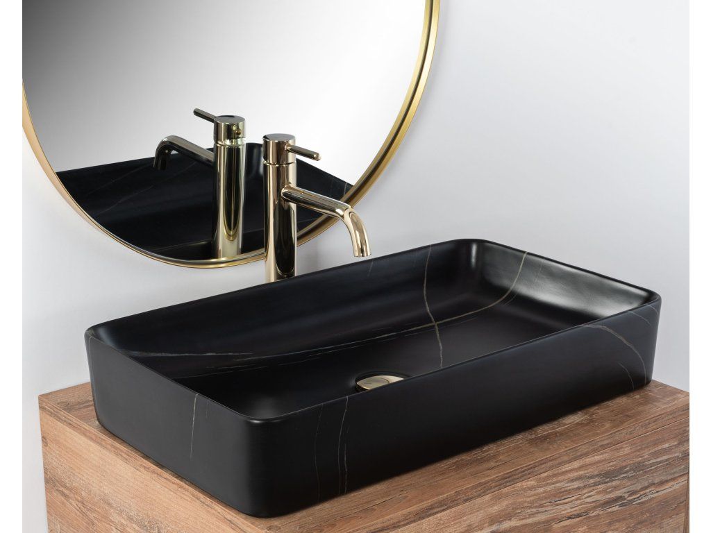 Umyvadlo v černém matném provedení s mramorovým efektem se navíc díky speciální fázi výroby snadno čistí, je velice odolné a má svůj jedinečný vzor.