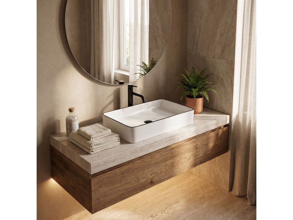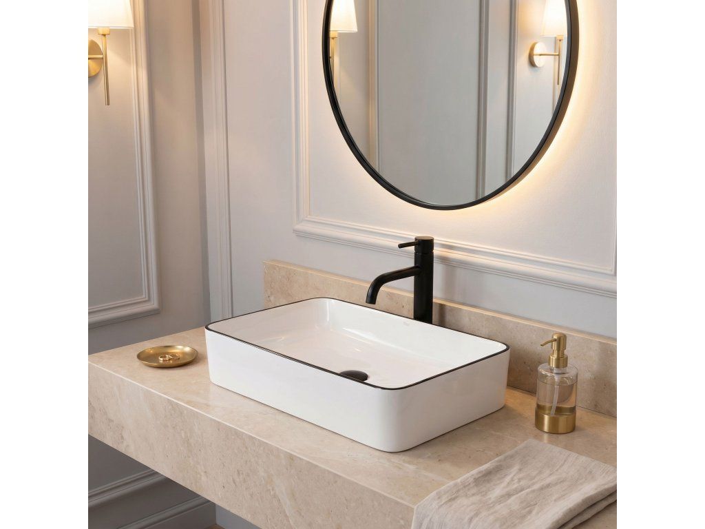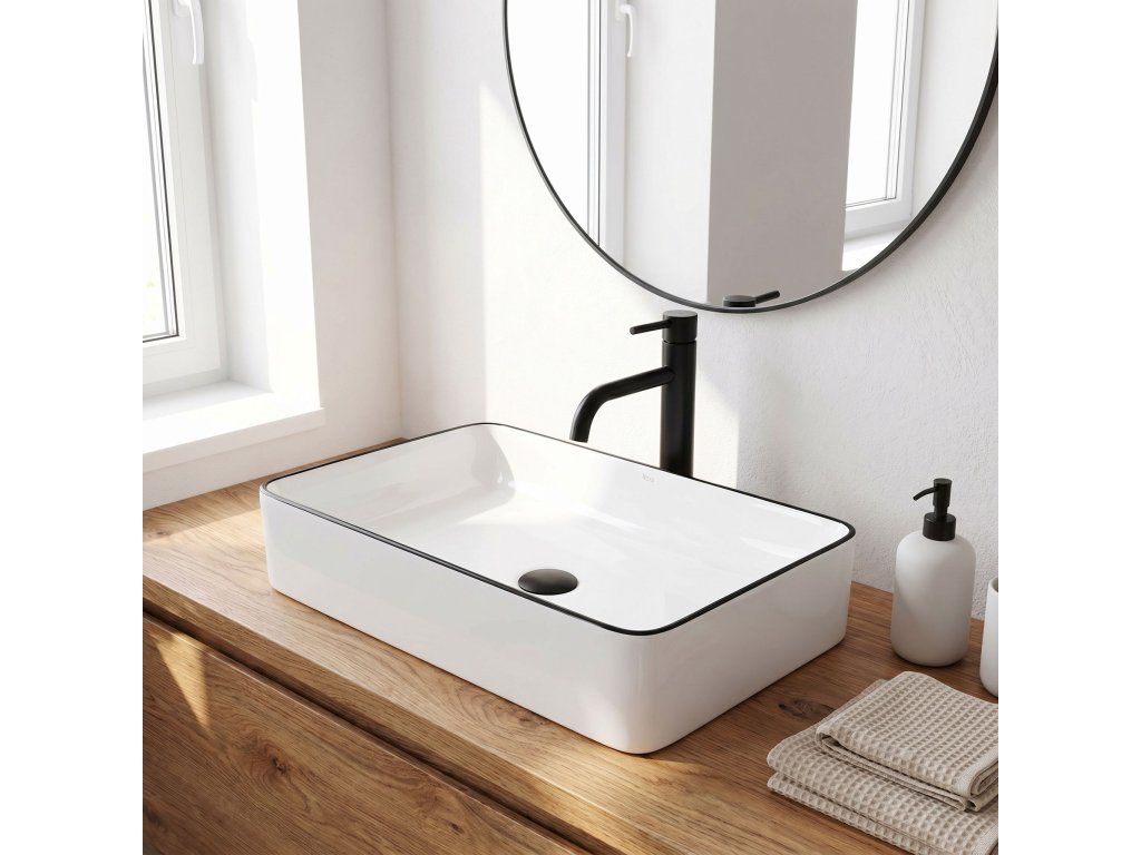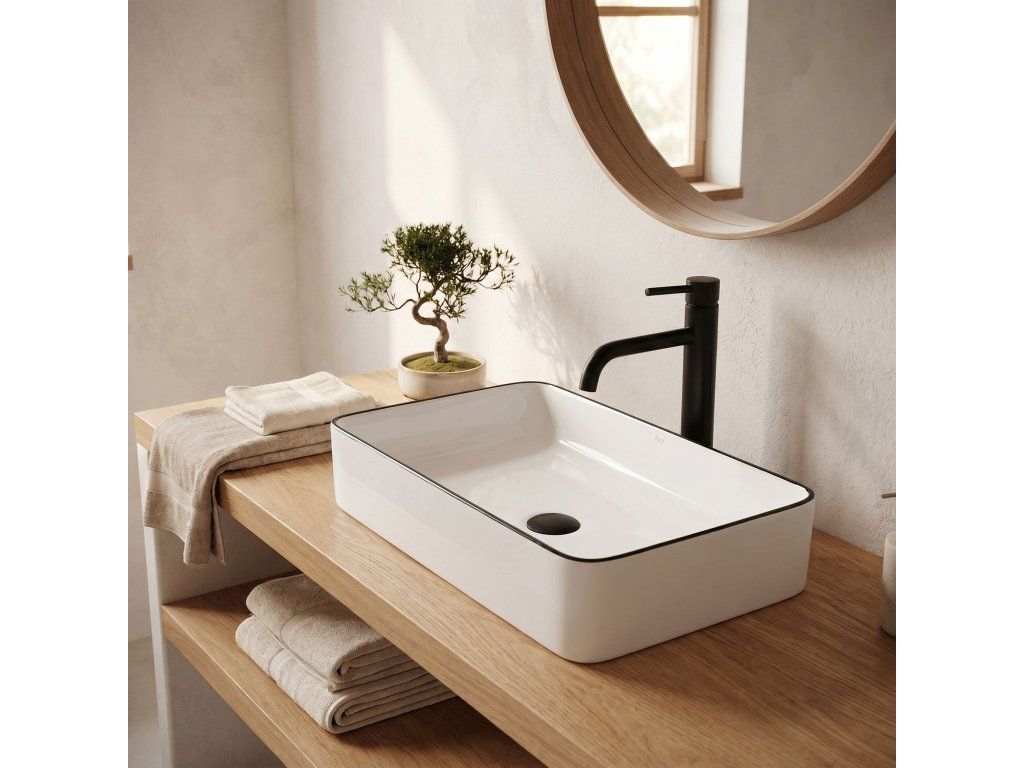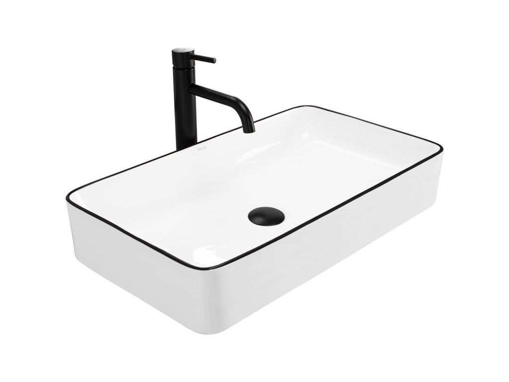 Umyvadlo v bílém lesklém provedení s černým stylovým okrajem se navíc díky speciální fázi výroby snadno čistí a je velice odolné.