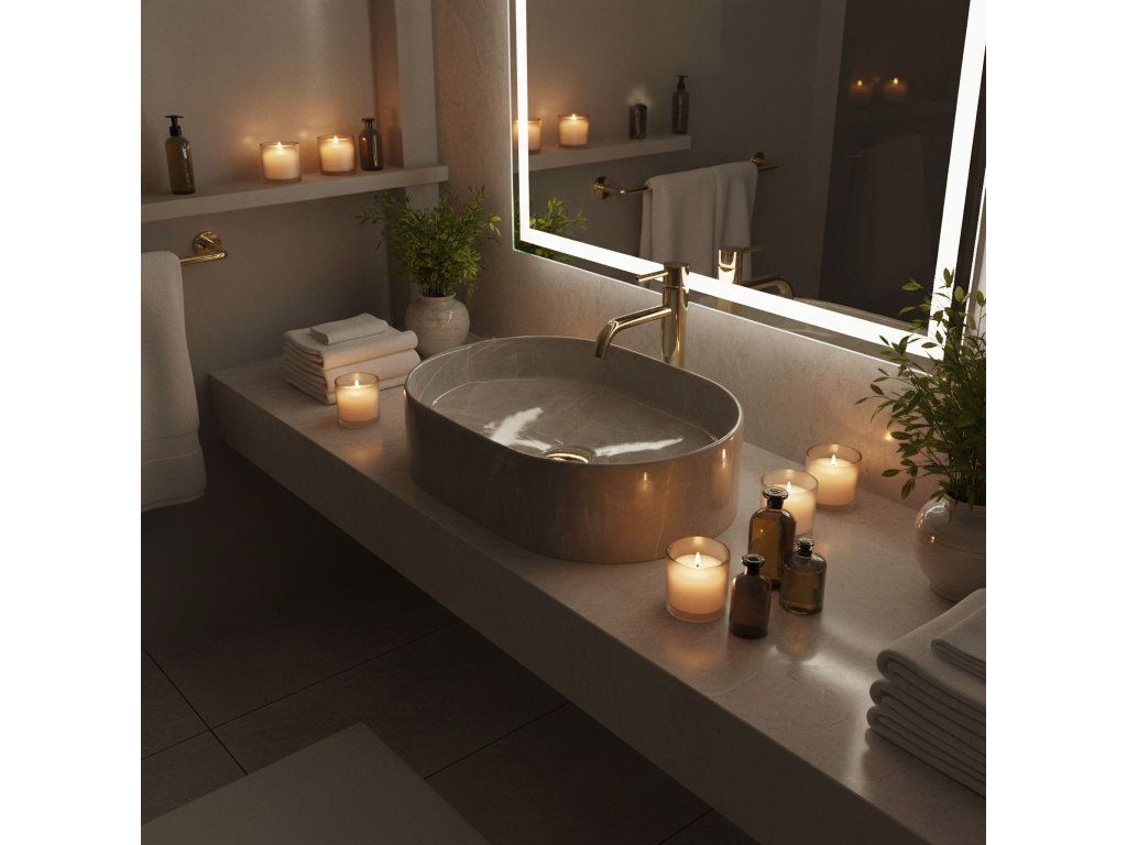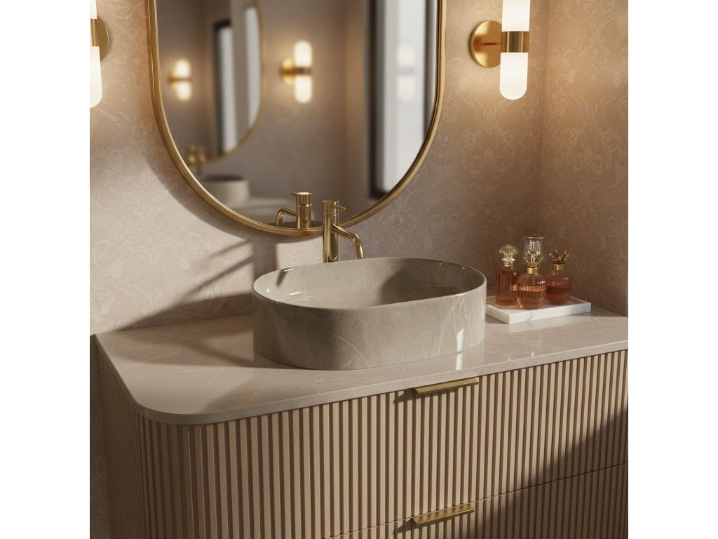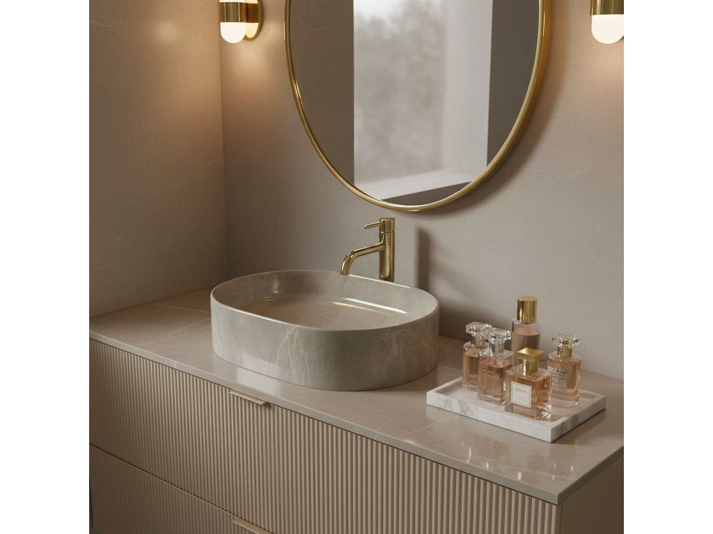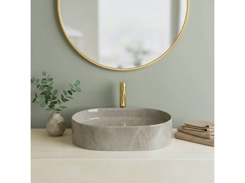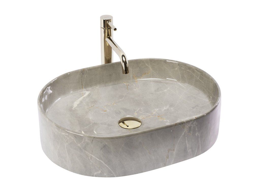 Umyvadlo v provedení, které napodobuje světlý kámen, se navíc díky speciální fázi výroby snadno čistí, je velice odolné a má jedinečný vzor.