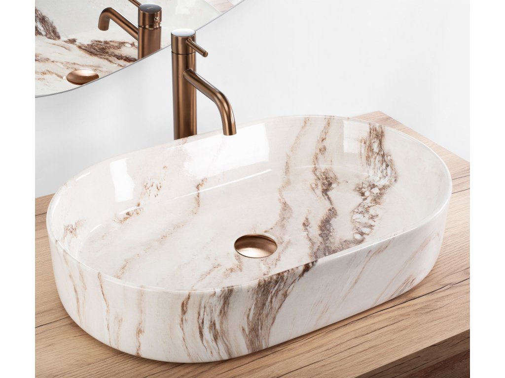Umyvadlo v provedení, které napodobuje světlý kámen, se navíc díky speciální fázi výroby snadno čistí, je velice odolné a má jedinečný vzor.