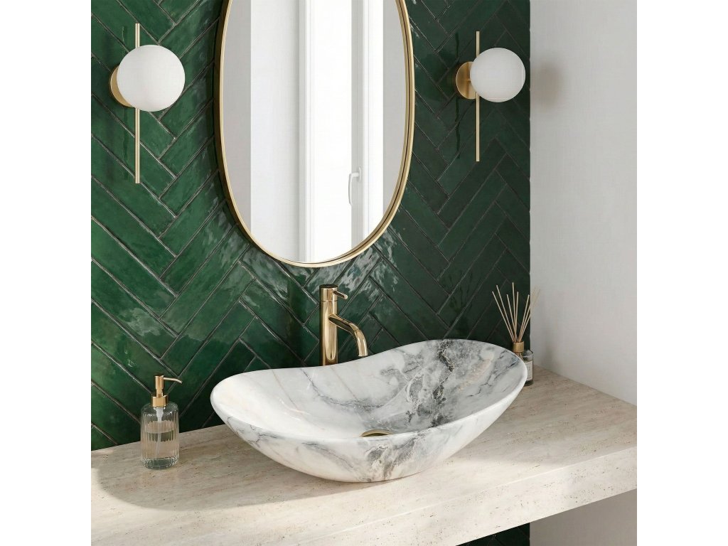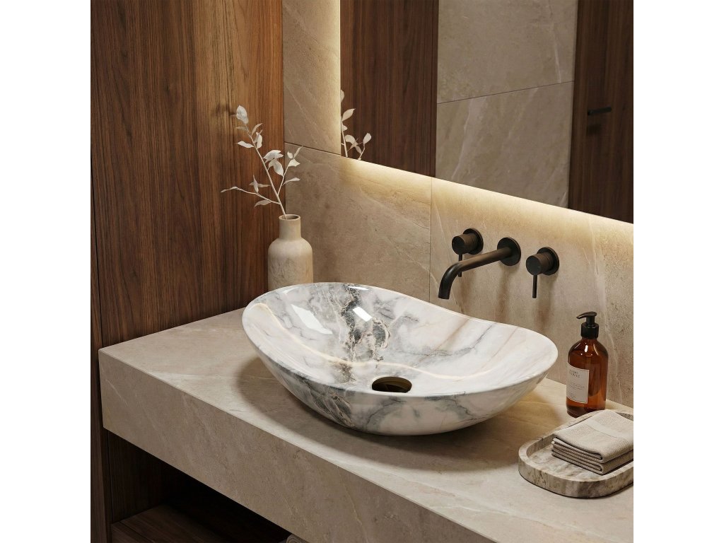 Umyvadlo v bílém lesklém provedení se žulovým efektem se navíc díky speciální fázi výroby snadno čistí, je velice odolné a má svůj jedinečný vzor.