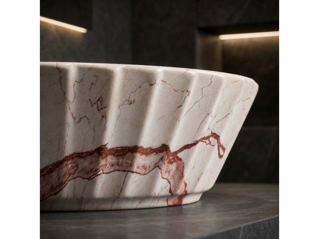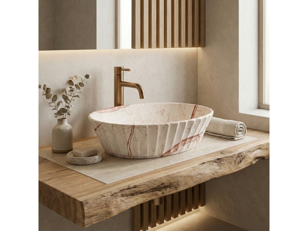 Umyvadlo na desku Rea Samanta Zen s výraznou, sochařsky působící formou je volbou pro ty, kteří chtějí do koupelny vnést skutečný designový prvek. Model Samanta Zen se vyznačuje jemně nepravidelným oválným tvarem mísy, který dodává celku měkkost a moderní eleganci, zatímco decentní žebrování na vnějších stěnách podtrhuje dekorativní charakter produktu. Nejde jen o vybavení, ale o výrazný aranžérský akcent, který přitahuje pozornost a vytváří výjimečnou atmosféru.Povrch umyvadla Rea Samanta Zen je opatřen efektním vzorem inspirovaným přírodním kamenem, s teplými mramorovými žilkami v odstínech béžové a karamelu. Tato barevnost se krásně hodí ke světlým deskám, dřevu i k kontrastnějším, tmavším aranžím. Hladké, na dotek příjemné vykořenění v kombinaci s komfortní hloubkou mísy zajišťuje, že Samanta Zen je nejen působivé na pohled, ale také pohodlné při každodenním používání.