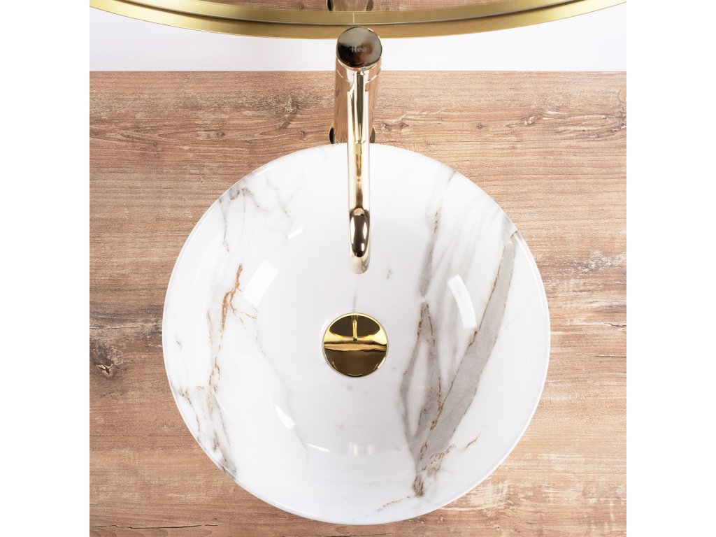 Umyvadlo v bílém lesklém provedení s mramorovým efektem se navíc díky speciální fázi výroby snadno čistí, je velice odolné a má svůj jedinečný vzor.