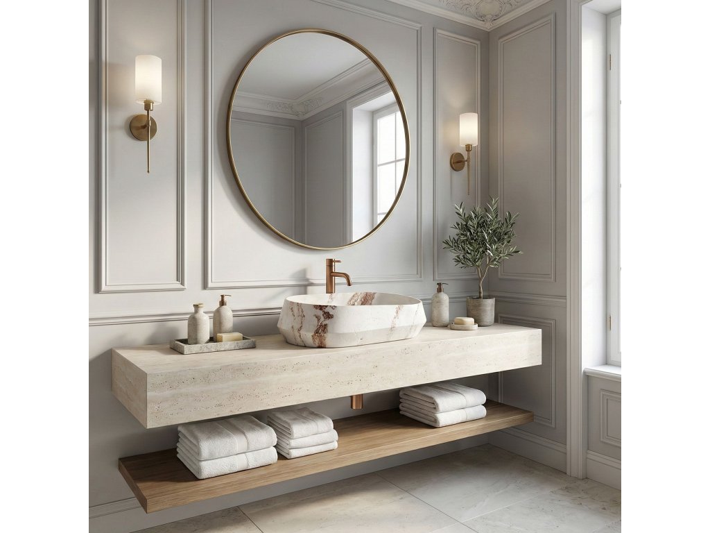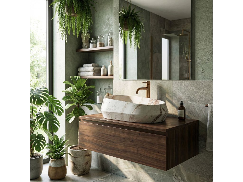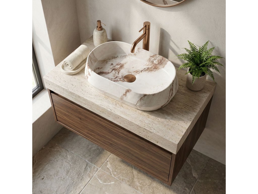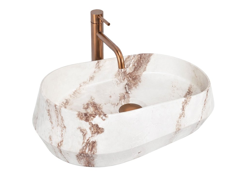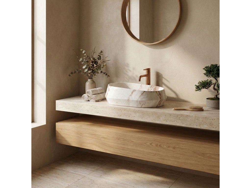 Umyvadlo Rea Zoe Travo se hodí do moderních interiérů i do aranžmá ve stylu boho či wabi-sabi. Jeho geometrická, asymetrická forma v teplých tónech je výrazným prvkem prostoru a nahrazuje tradiční oválné mísy.