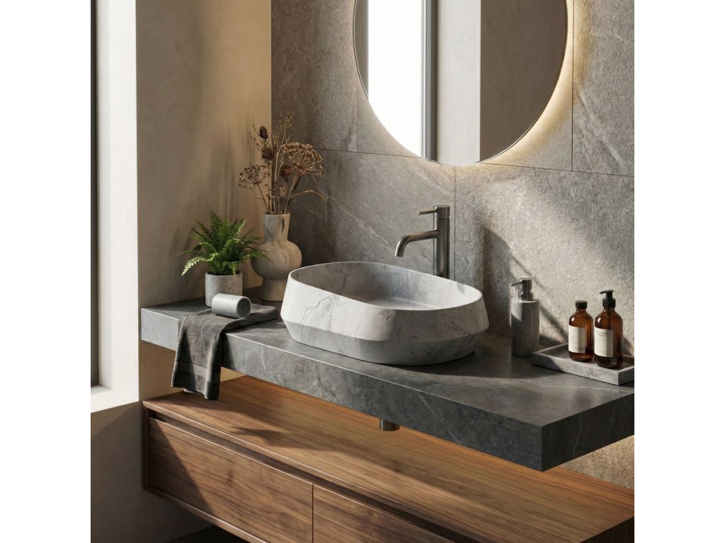 Vyberte si umyvadlo na desku Rea Zoe Venice, pokud hledáte moderní a netypická řešení do své koupelny. Tento model vyniká asymetrickou konstrukcí a strukturou inspirovanou přírodním kamenem. Je vyroben z odolného kompozitu Artificial Stone, takže spojuje zajímavý vzhled s vysokou užitnou odolností.Asymetrická forma – charakteristickým prvkem umyvadla je nepravidelná výška. Jeden bok mísy je zřetelně vyšší než druhý, což vytváří moderní, „seříznutý“ tvar.Materiál Artificial Stone – použitý kompozitní umělý kámen je pevný a odolný vůči mechanickému poškození a na dotek působí tepleji než běžná keramika.Design Venice – matný povrch v elegantním holubičím šedém odstínu s jemným kamenným žilkováním a decentními zalomeními na vnějších stěnách dodává tvaru moderní, chladný charakter.Hladký vnitřek – na rozdíl od strukturovaného pláště je vnitřek mísy dokonale hladký, což zajišťuje volný odtok vody a usnadňuje každodenní čištění.Montáž na desku – umyvadlo je určeno k instalaci na desku nebo skříňku, takže jeho netypická forma zůstává plně viditelná.Umyvadlo Rea Zoe Venice se hodí do moderních, industriálních i minimalistických interiérů. Jeho geometrická, asymetrická forma v holubičích šedých tónech je výrazným prvkem prostoru a nahrazuje tradiční oválné mísy.