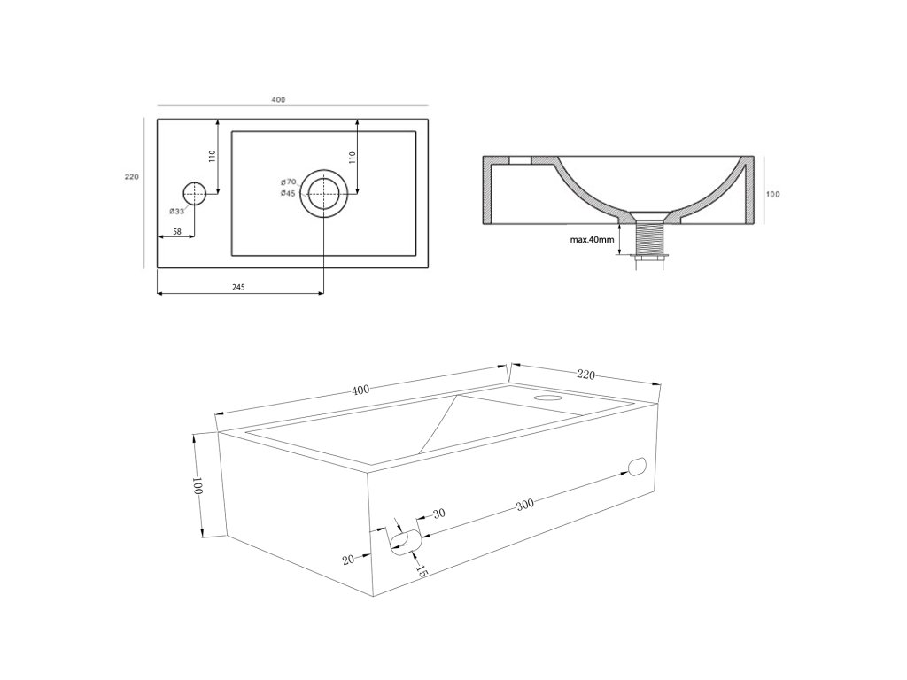 CREST L betonové umývátko, nástěnné, včetně výpusti, 40x22cm, černý granit