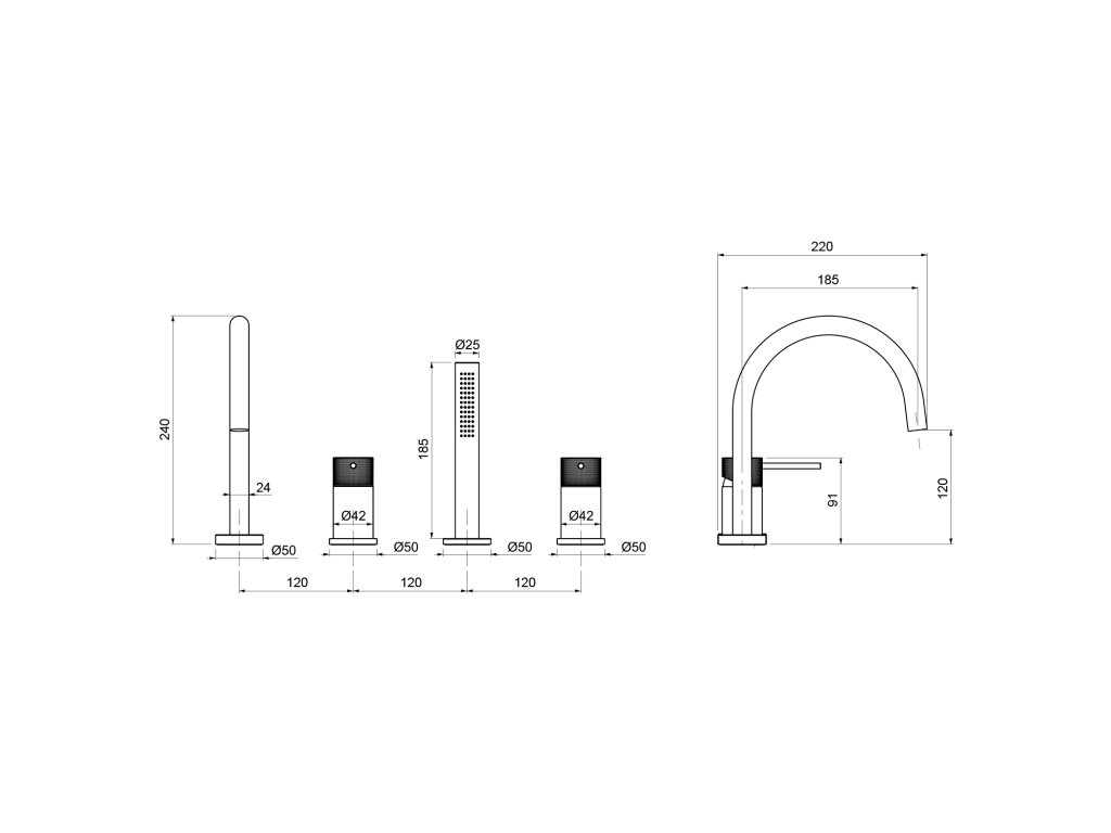 TURSI čtyřprvková baterie na okraj vany, černá mat