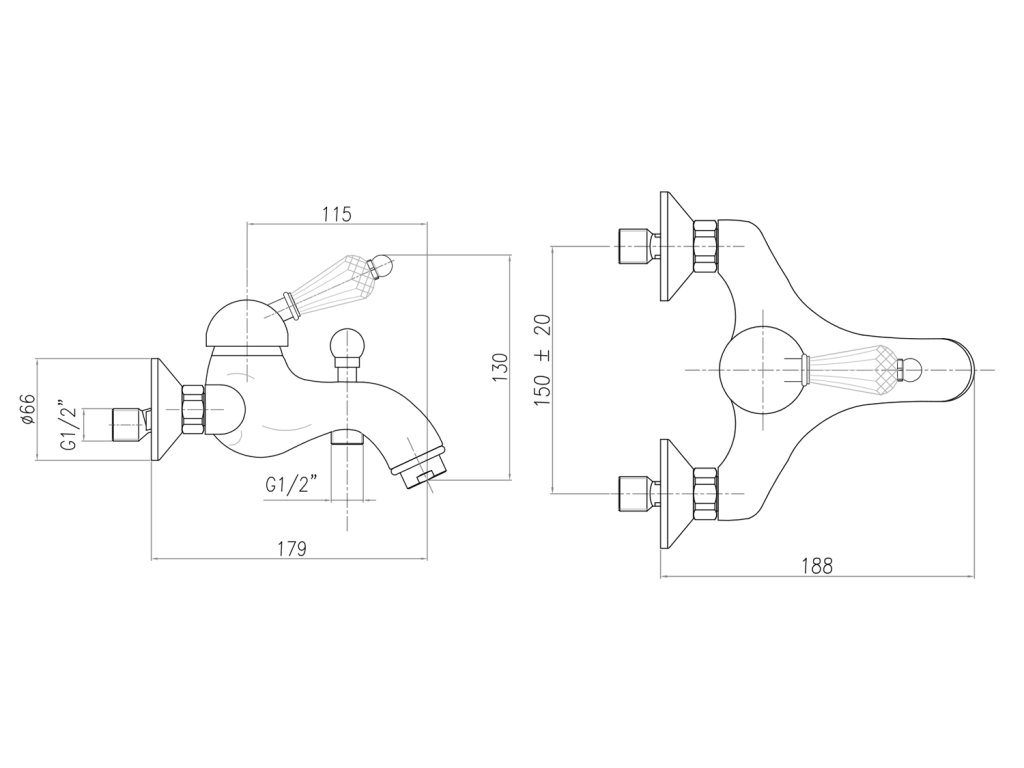 KIRKÉ CRYSTAL nástěnná vanová baterie, páčka krystal, bronz