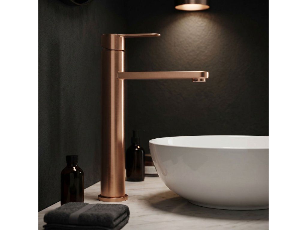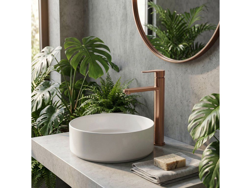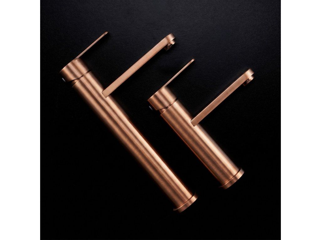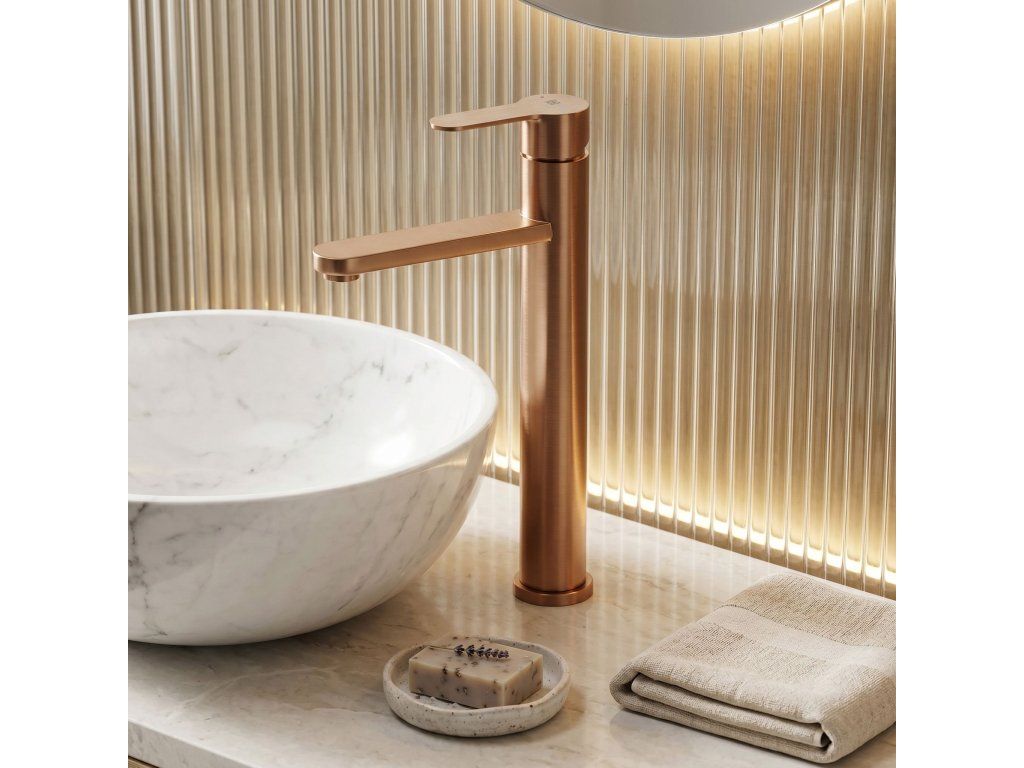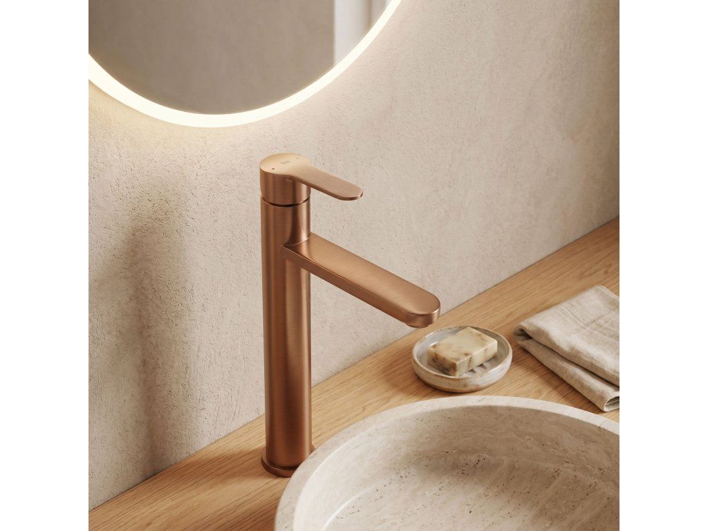 Vysoká umyvadlová baterie Arcos v barvě Brushed Copper je elegantní řešení navržené pro moderní koupelny. Díky své výšce je tento model ideální pro montáž přímo na desku vedle umyvadel na desku.Povrchová úprava Brushed Copper (PVD) – technologicky vyspělý PVD povlak poskytuje výjimečnou odolnost proti poškrábání a korozi. Unikátní, ušlechtilý odstín v kartáčovaném provedení je velmi praktický, protože účinně snižuje viditelnost skvrn od vody a otisků prstů.Vysoké tělo – design baterie byl optimalizován pro umyvadla na desku, poskytuje dostatečný prostor a vysoký komfort při každodenním používání.Pevné mosazné tělo – vyrobeno z vysoce kvalitní mosazi, zaručuje plnou stabilitu a dlouholetou životnost produktu.Keramická kartuše – použití špičkové keramické kartuše umožňuje plynulou a přesnou regulaci proudu a teploty vody.Elegantní linie – štíhlá konstrukce s moderní, plochou a ergonomickou rukojetí zajišťuje, že model Arcos dokonale ladí s minimalistickou a luxusní koupelnovou architekturou.Výběrem vysoké baterie Arcos získáte spolehlivou armaturu, která si díky odolnému PVD povlaku zachová estetický vzhled po mnoho let.