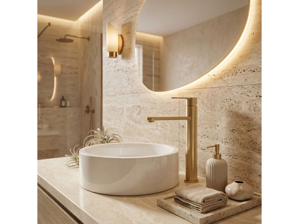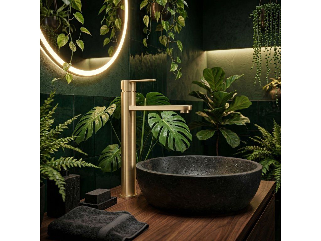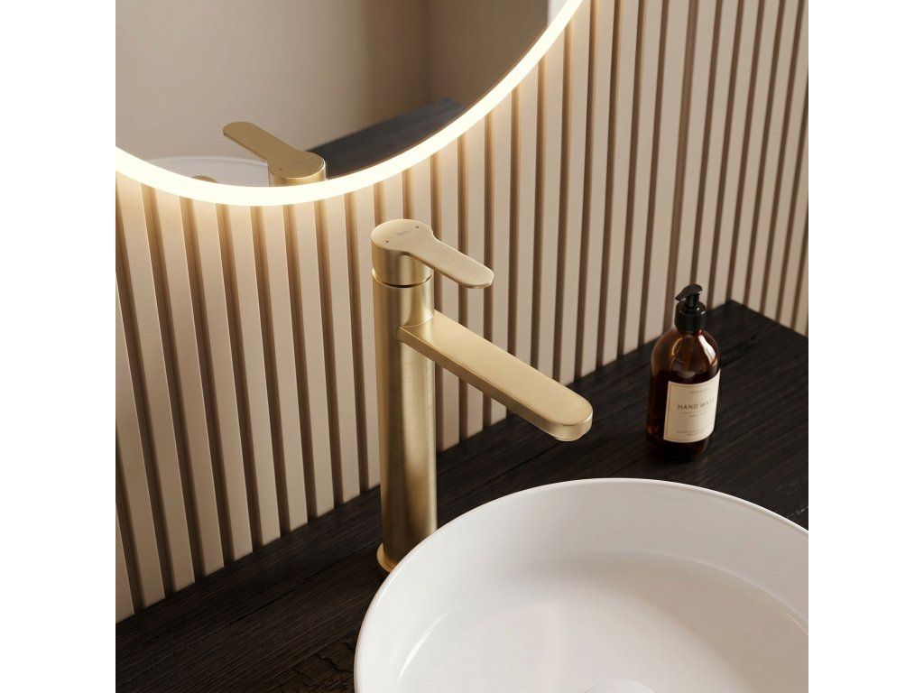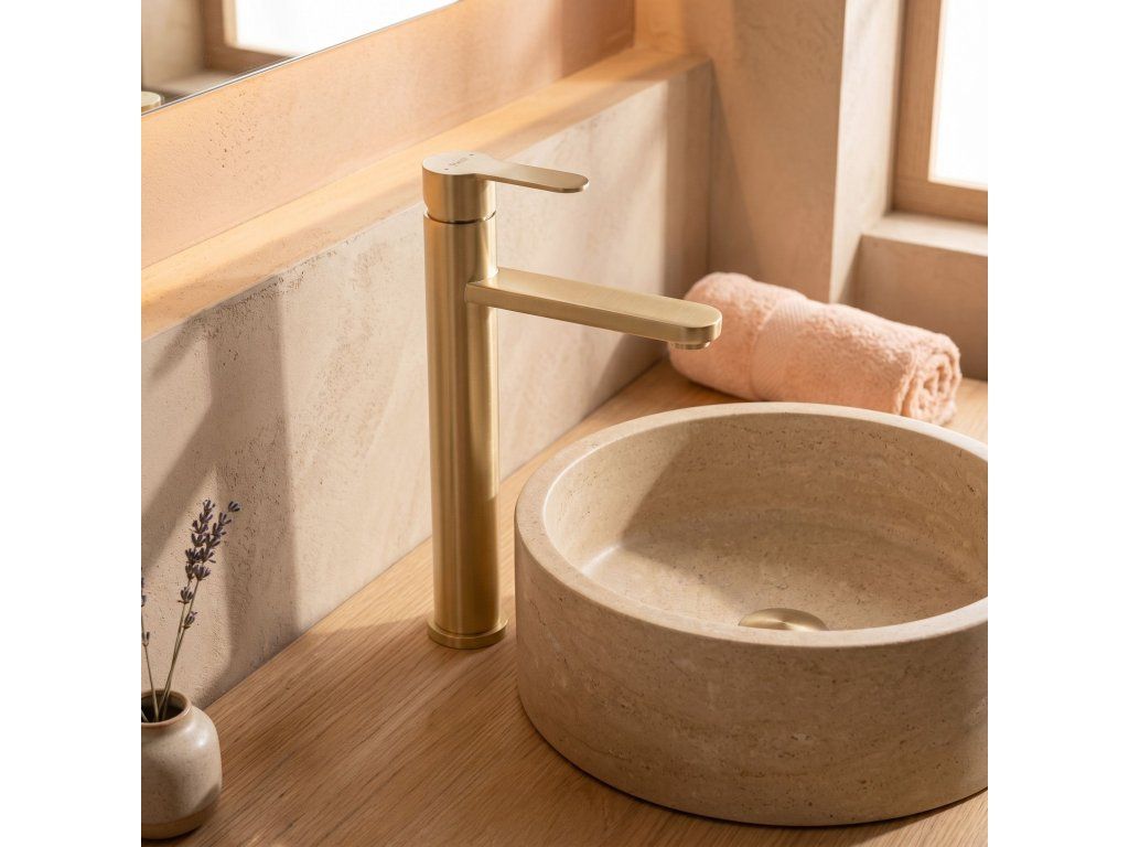 Vysoká umyvadlová baterie Arcos v barvě Brushed Gold je elegantní řešení navržené pro moderní koupelny. Díky své výšce je tento model ideální pro montáž přímo na desku vedle umyvadel na desku.Povrchová úprava Brushed Gold (PVD) – technologicky vyspělý PVD povlak poskytuje výjimečnou odolnost proti poškrábání a korozi. Teplý, ušlechtilý odstín v kartáčovaném provedení je velmi praktický, protože účinně snižuje viditelnost skvrn od vody a otisků prstů.Vysoké tělo – design baterie byl optimalizován pro umyvadla na desku, poskytuje dostatečný prostor a vysoký komfort při každodenním používání.Pevné mosazné tělo – vyrobeno z vysoce kvalitní mosazi, zaručuje plnou stabilitu a dlouholetou životnost produktu.Keramická kartuše – použití špičkové keramické kartuše umožňuje plynulou a přesnou regulaci proudu a teploty vody.Elegantní linie – štíhlá konstrukce s moderní, plochou a ergonomickou rukojetí zajišťuje, že model Arcos dokonale ladí s minimalistickou a luxusní koupelnovou architekturou.Výběrem vysoké baterie Arcos získáte spolehlivou armaturu, která si díky odolnému PVD povlaku zachová estetický vzhled po mnoho let.