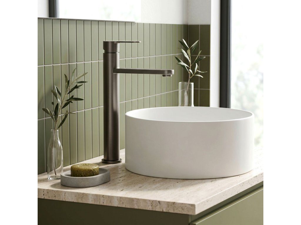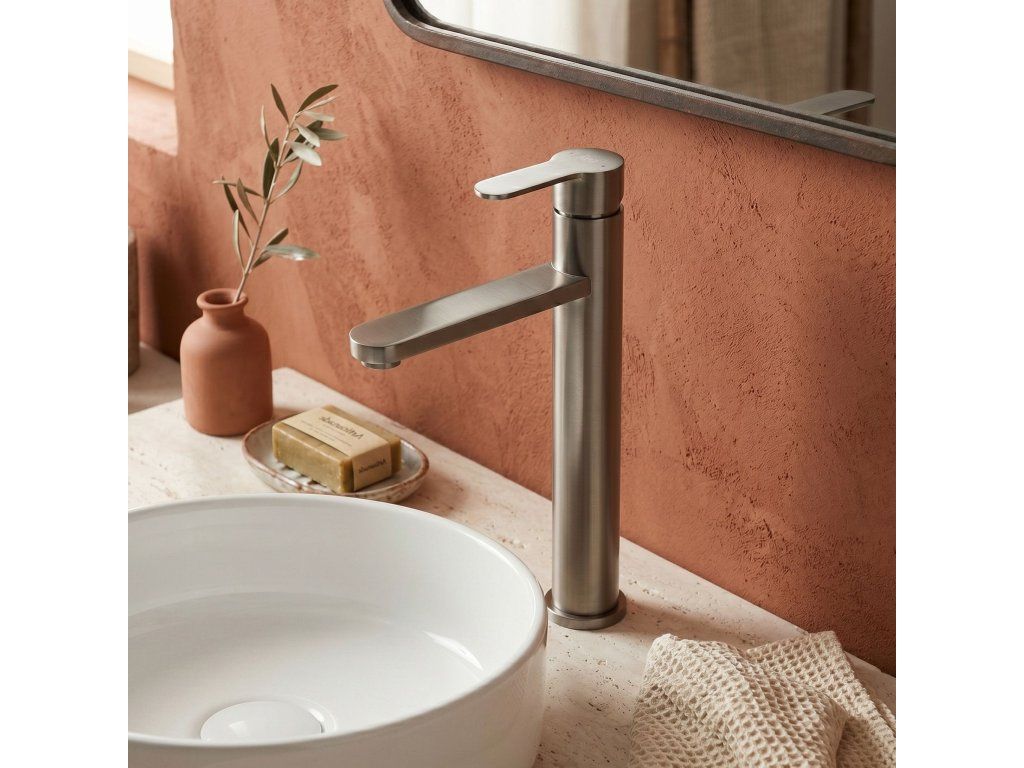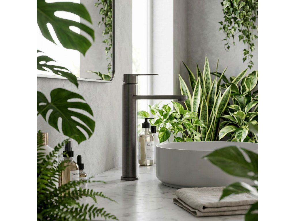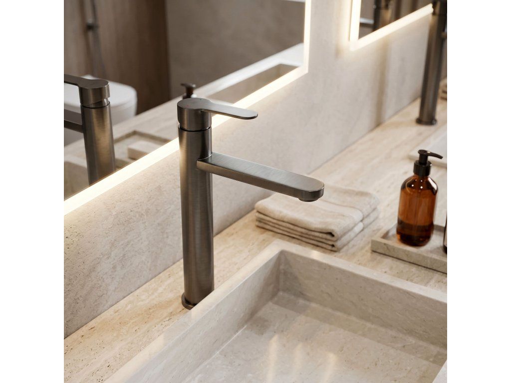 Vysoká umyvadlová baterie Arcos v barvě Brushed Titanium je elegantní řešení navržené pro moderní koupelny. Díky své výšce je tento model ideální pro montáž přímo na desku vedle umyvadel na desku.Povrchová úprava Brushed Titanium (PVD) – technologicky vyspělý PVD povlak poskytuje výjimečnou odolnost proti poškrábání a korozi. Moderní, hluboký odstín v kartáčovaném provedení je velmi praktický, protože účinně snižuje viditelnost skvrn od vody a otisků prstů.Vysoké tělo – design baterie byl optimalizován pro umyvadla na desku, poskytuje dostatečný prostor a vysoký komfort při každodenním používání.Pevné mosazné tělo – vyrobeno z vysoce kvalitní mosazi, zaručuje plnou stabilitu a dlouholetou životnost produktu.Keramická kartuše – použití špičkové keramické kartuše umožňuje plynulou a přesnou regulaci proudu a teploty vody.Elegantní linie – štíhlá konstrukce s moderní, plochou a ergonomickou rukojetí zajišťuje, že model Arcos dokonale ladí s minimalistickou a moderní koupelnovou architekturou.Výběrem vysoké baterie Arcos získáte spolehlivou armaturu, která si díky odolnému PVD povlaku zachová estetický vzhled po mnoho let.