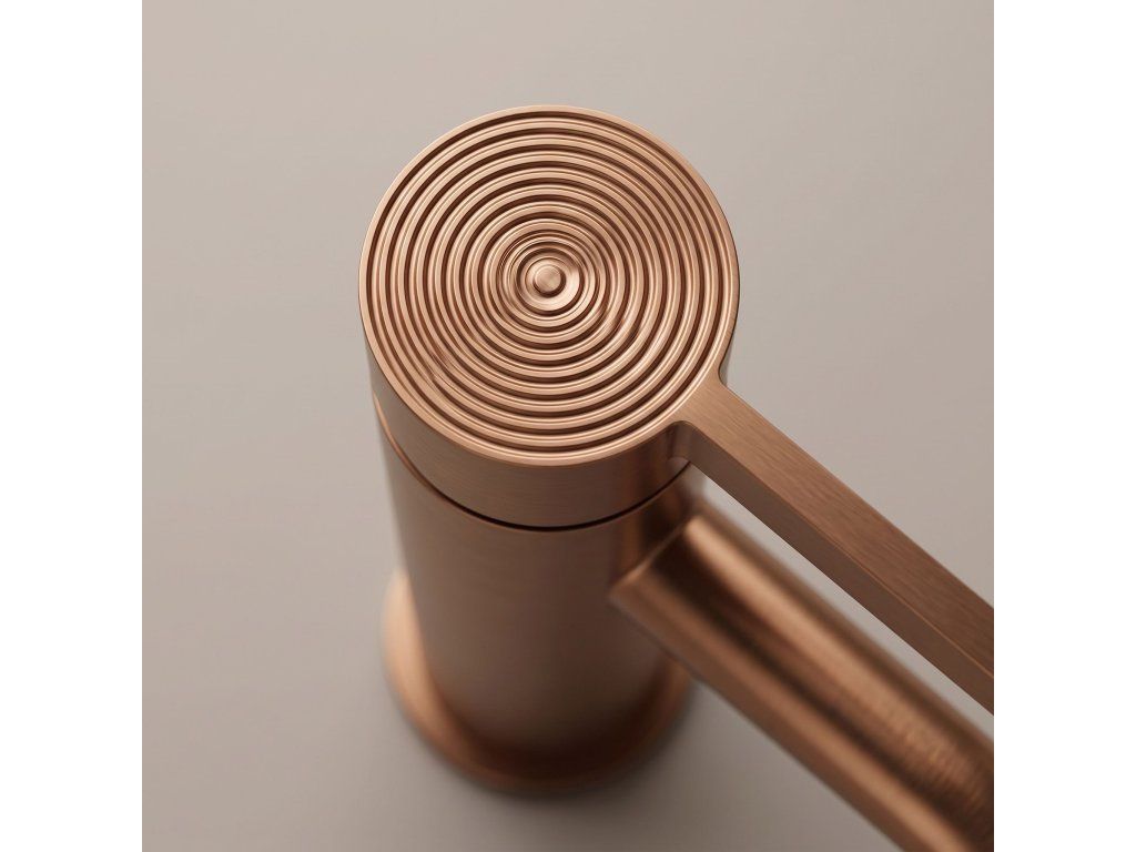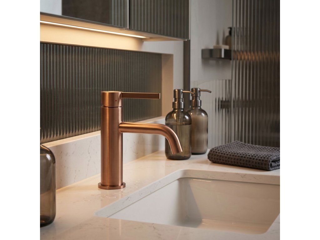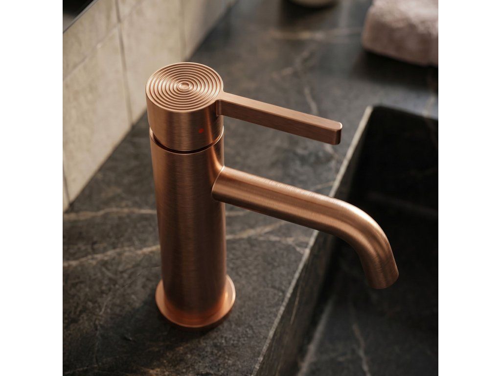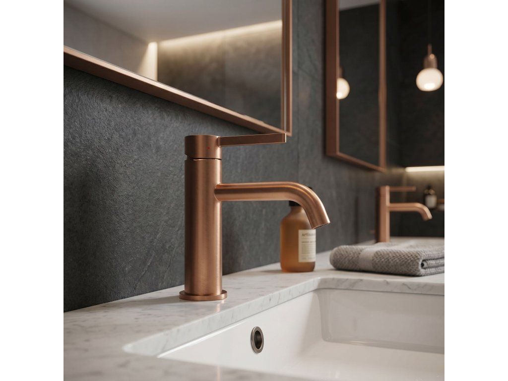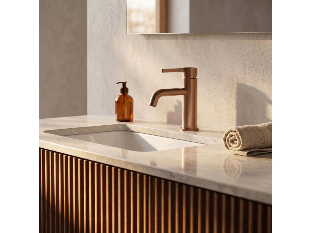 Nízká umyvadlová baterie Foster v barvě Brushed Copper je elegantní návrh, který vyniká nekonvenčním designem a vysokou kvalitou zpracování. Její kompaktní forma se dokonale hodí do moderních koupelnových aranžmá.Ozdobný vzor na baterii – horní část těla byla dokončena přesnými, soustřednými drážkami. Tento geometrický akcent odlišuje baterii od klasických modelů a dodává jí moderní charakter.Povrchová úprava Brushed Copper (PVD) – povlak nanesený technologií PVD zajišťuje maximální životnost a odolnost proti poškrábání a korozi. Teplý, matný odstín mědi působí luxusně a usnadňuje udržování baterie v čistotě.Pevná mosazná konstrukce – výroba těla z vysoce kvalitní mosazi zaručuje stabilitu a spolehlivost produktu po mnoho let.Keramická kartuše – použití prvotřídní keramické kartuše zajišťuje plynulou a přesnou regulaci proudu a teploty vody, čímž se minimalizuje riziko netěsností.Použití a montáž – díky nízké konstrukci baterie perfektně spolupracuje se zápustnými umyvadly a umyvadly s otvorem pro baterii, což zajišťuje pohodlný dosah proudu vody.Výběrem baterie Foster Brushed Copper investujete do produktu, který kombinuje spolehlivou technologii s jedinečným designem a vnáší do koupelny ušlechtilý barevný akcent.