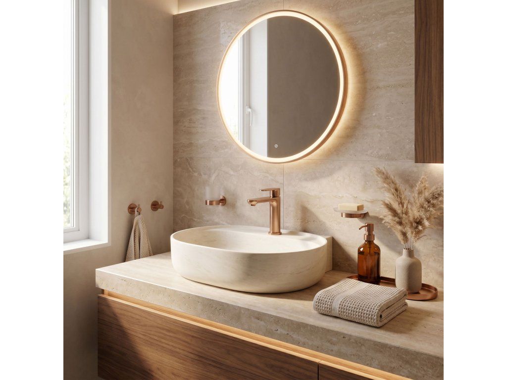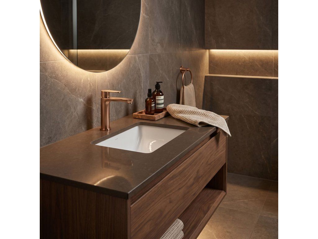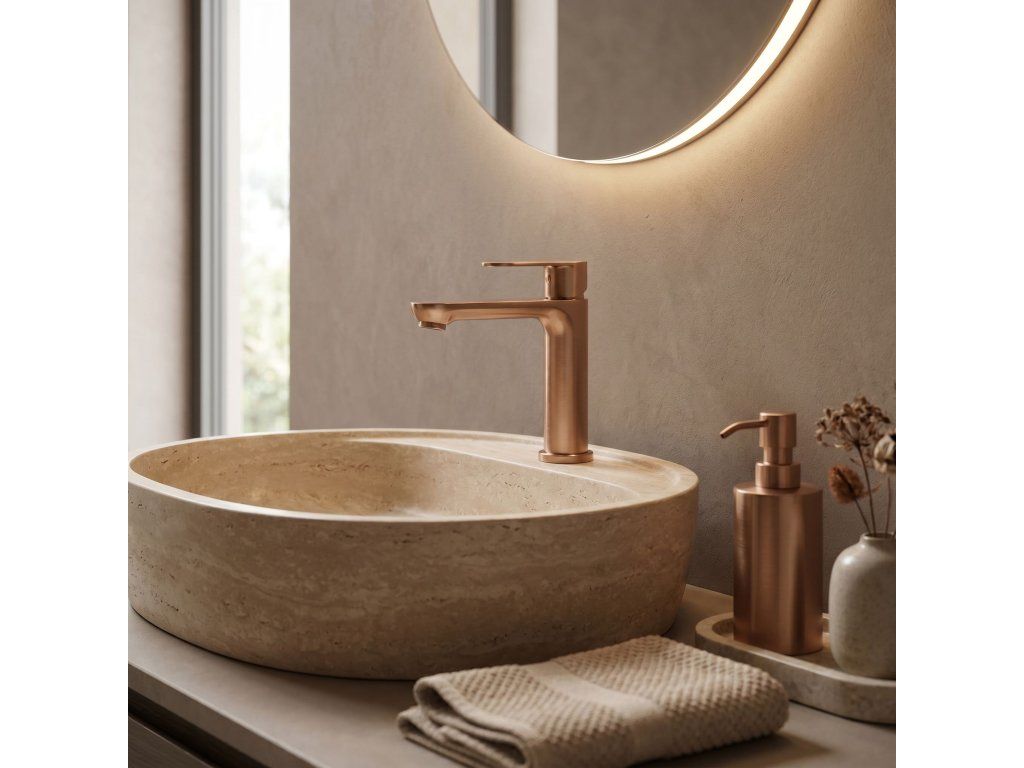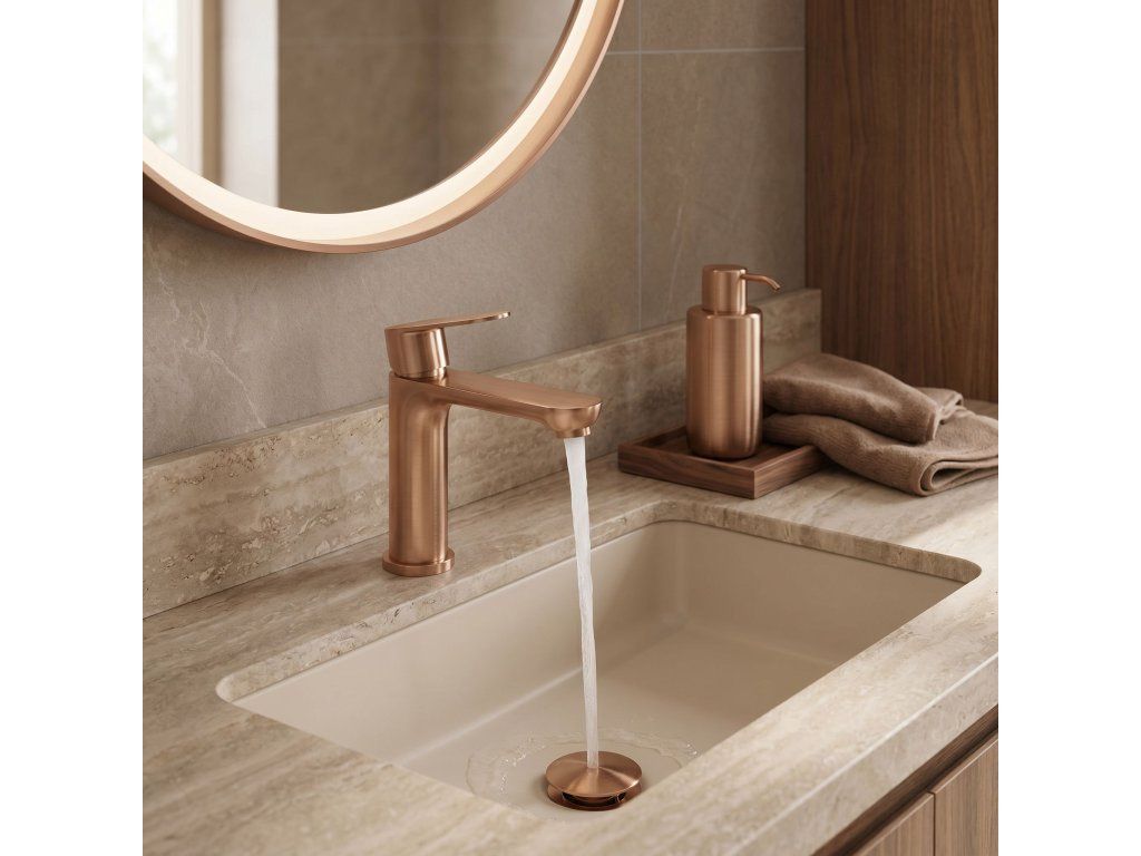 Nízká umyvadlová baterie Logan v barvě Brushed Copper je spojením jednoduché formy s vysokou funkčností. Díky nízké konstrukci je to ideální model pro umyvadla zapuštěná do desky, umyvadla pod desku a umyvadla s továrním otvorem pro armaturu.Povrchová úprava Brushed Copper (PVD) – technologicky vyspělý PVD povlak poskytuje výjimečnou odolnost proti poškrábání a vnějším vlivům. Ušlechtilý, matný odstín v kartáčovaném provedení je velmi praktický – účinně maskuje skvrny od vody a otisky prstů a zároveň vnáší do interiéru teplý, originální akcent.Pevné mosazné tělo – zpracování z vysoce kvalitní mosazi je zárukou trvanlivosti, stability a plné odolnosti proti korozi po léta používání.Keramická kartuše – vnitřek baterie je vybaven špičkovou keramickou kartuší, což se promítá do plynulé a přesné regulace proudu a teploty vody.Ergonomický design – plochá, pohodlná rukojeť a vhodně profilovaný výtok zajišťují pohodlné každodenní používání a zároveň udržují moderní vzhled mycí zóny.Výběrem baterie Logan v barvě Brushed Copper získáte spolehlivý koupelnový prvek, který si díky odolnému PVD povlaku a pevným materiálům zachová svůj jedinečný, luxusní vzhled a funkčnost po dlouhou dobu.