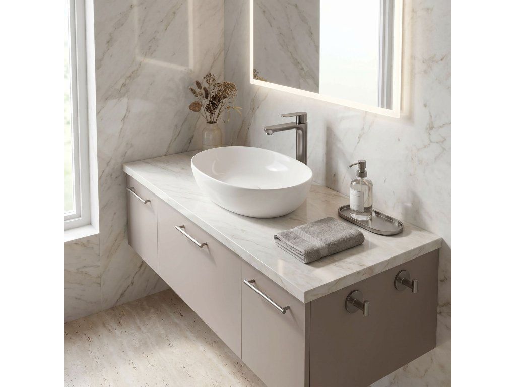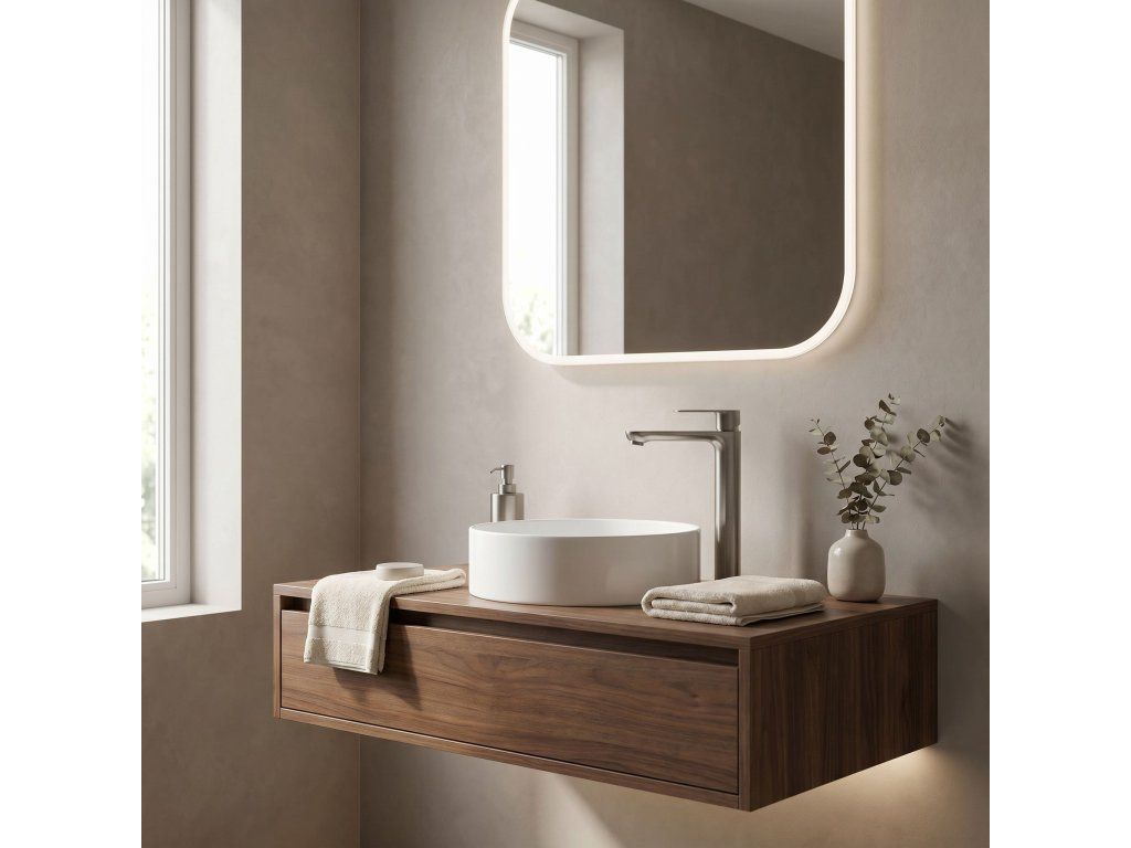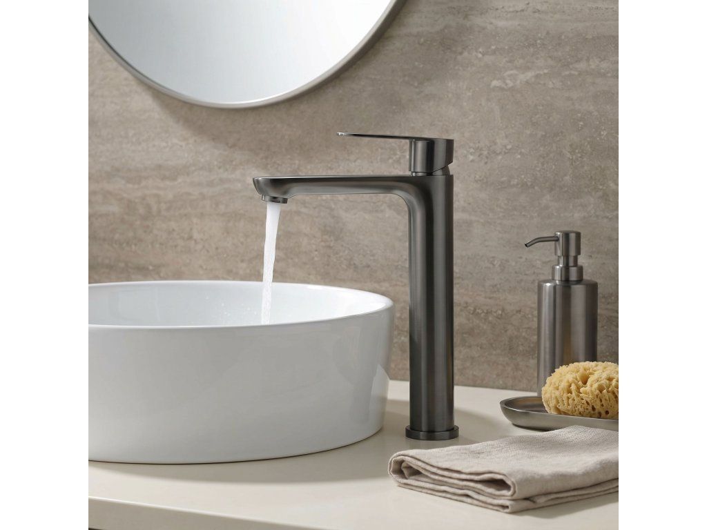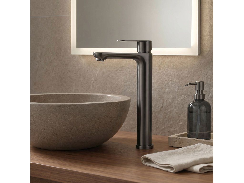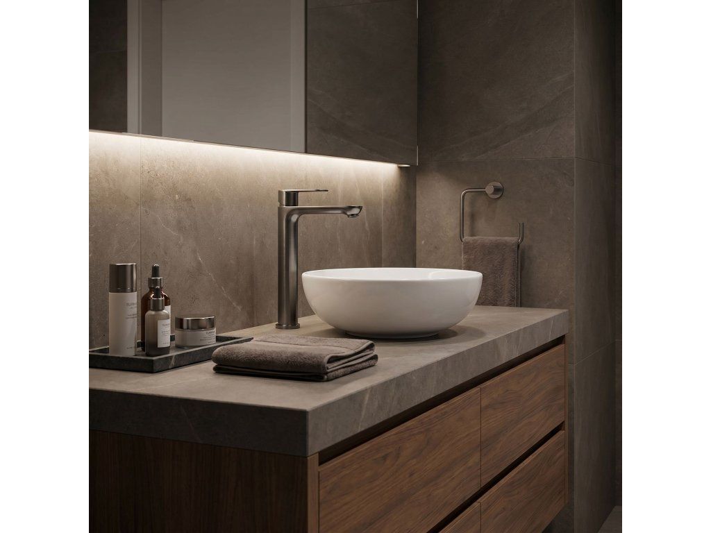 Vysoká umyvadlová baterie Logan v barvě Titanium je elegantní řešení navržené pro moderní koupelny. Díky své výšce je tento model ideální pro montáž přímo na desku vedle umyvadel na desku.Povrchová úprava Titanium (PVD) – technologicky vyspělý PVD povlak poskytuje výjimečnou odolnost proti poškrábání a korozi. Hluboký, tmavě šedý odstín vnáší do interiéru výrazný, industriální akcent a je velmi praktický, protože účinně snižuje viditelnost skvrn od vody a otisků prstů.Vysoké tělo – design baterie byl optimalizován pro umyvadla na desku, poskytuje dostatečný prostor a vysoký komfort při každodenním používání.Pevné mosazné tělo – vyrobeno z vysoce kvalitní mosazi, zaručuje plnou stabilitu a dlouholetou životnost produktu.Keramická kartuše – použití špičkové keramické kartuše umožňuje plynulou a přesnou regulaci proudu a teploty vody.Moderní linie – štíhlý, válcový tvar v kombinaci s plochou, ergonomickou rukojetí zajišťuje, že model Logan dokonale ladí s minimalistickou koupelnovou architekturou.Výběrem vysoké baterie Logan v barvě Titanium získáte spolehlivou armaturu, která díky odolnému PVD povlaku vnáší do interiéru moderní charakter a zachová si estetický vzhled po mnoho let.