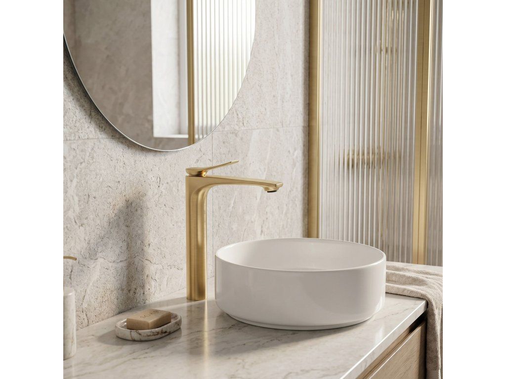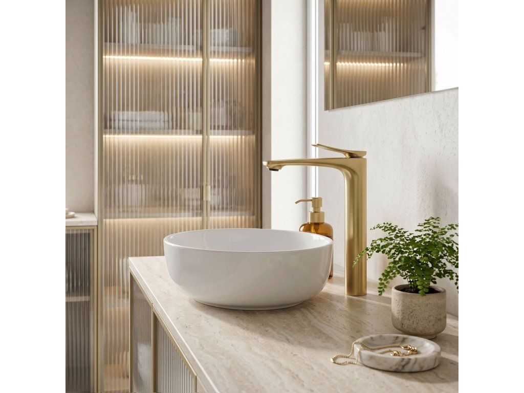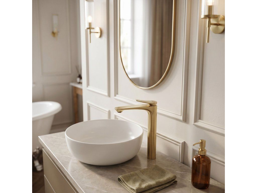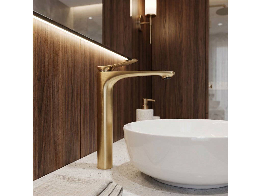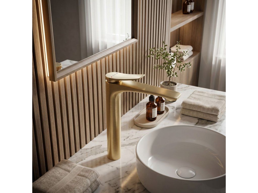 Vysoká umyvadlová baterie Vision v barvě Brushed Gold je elegantním návrhem pro moderní a luxusní umyvadlové zóny. Štíhlá, vysoká forma a jemně tvarovaná linie výtoku jí dodávají na lehkosti a ušlechtilá povrchová úprava v odstínu Brushed Gold vnáší do interiéru teplo a rafinovaný charakter.Vysoká konstrukce na desku – baterie byla navržena pro umyvadla na desku, kterým poskytuje pohodlný prostor pro každodenní použití a ucelený, elegantní vzhled celé mycí zóny.Povrchová úprava Brushed Gold – efektní, teplý tón s jemnou kartáčovanou strukturou krásně zdůrazňuje moderní design baterie a dokonale ladí se světlým kamenem, keramikou, dřevem a tmavšími, luxusními akcenty interiéru.PVD povlak – moderní technologie nanášení povlaku zvyšuje odolnost povrchu proti oděru, poškrábání a každodennímu používání a také pomáhá déle udržet hloubku barvy a elegantní vzhled armatury.Pevné tělo – odolná konstrukce zajišťuje stabilitu, odolnost vůči každodennímu používání a estetický vzhled po dlouhou dobu.Keramická kartuše – je zodpovědná za plynulou a přesnou regulaci teploty a proudu vody, což se promítá do komfortu a spolehlivého provozu armatury.Štíhlý, moderní design – harmonicky vedené tělo a mírně zvednutá rukojeť dodávají baterii subtilní, designový charakter, ideální do elegantních prémiových koupelen.Výběrem vysoké umyvadlové baterie Vision získáte kombinaci stylu, funkčnosti a nadčasové elegance. Jedná se o jedinečný prvek vybavení, který dokonale podtrhne charakter umyvadla na desku a dodá celému uspořádání luxusní povrchovou úpravu.