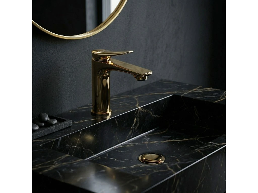 Umyvadlová baterie VISION premium ve zlaté barvě je ideální volbou pro ty, kteří oceňují nadčasový styl a eleganci v koupelně. Její propracovaná linie a lesklé provedení zajišťují, že se tato armatura skvěle hodí jak do klasických, tak moderních interiérů, včetně aranžmá ve stylu glamour. Lesklé zlaté provedení – klasický, zářivý odstín zlata je elegantním detailem, který krásně odráží světlo. Hladký povrch podtrhuje estetiku výrobku a snadno se udržuje v čistotě. Masivní mosazné tělo – zhotovení z kvalitní mosazi zaručuje výjimečnou odolnost, stabilitu a plnou ochranu proti korozi. Keramická kartuše – použití spolehlivé keramické kartuše zajišťuje plynulou a přesnou regulaci síly proudu i teploty vody po mnoho let používání. Prémiová linie – pečlivě navržený tvar a důraz na detaily podtrhují vysokou kvalitu zpracování a dodávají umyvadlové zóně ucelený, estetický vzhled. Univerzální konstrukce – ergonomické rozměry umožňují montáž na většinu umyvadel zapuštěných do desky i na desku s vyhrazeným otvorem pro armaturu. Volbou umyvadlové baterie VISION premium získáváte osvědčené řešení a elegantní vzhled. Jde o praktický a spolehlivý prvek vybavení, který skvěle doplní vzhled vaší koupelny.