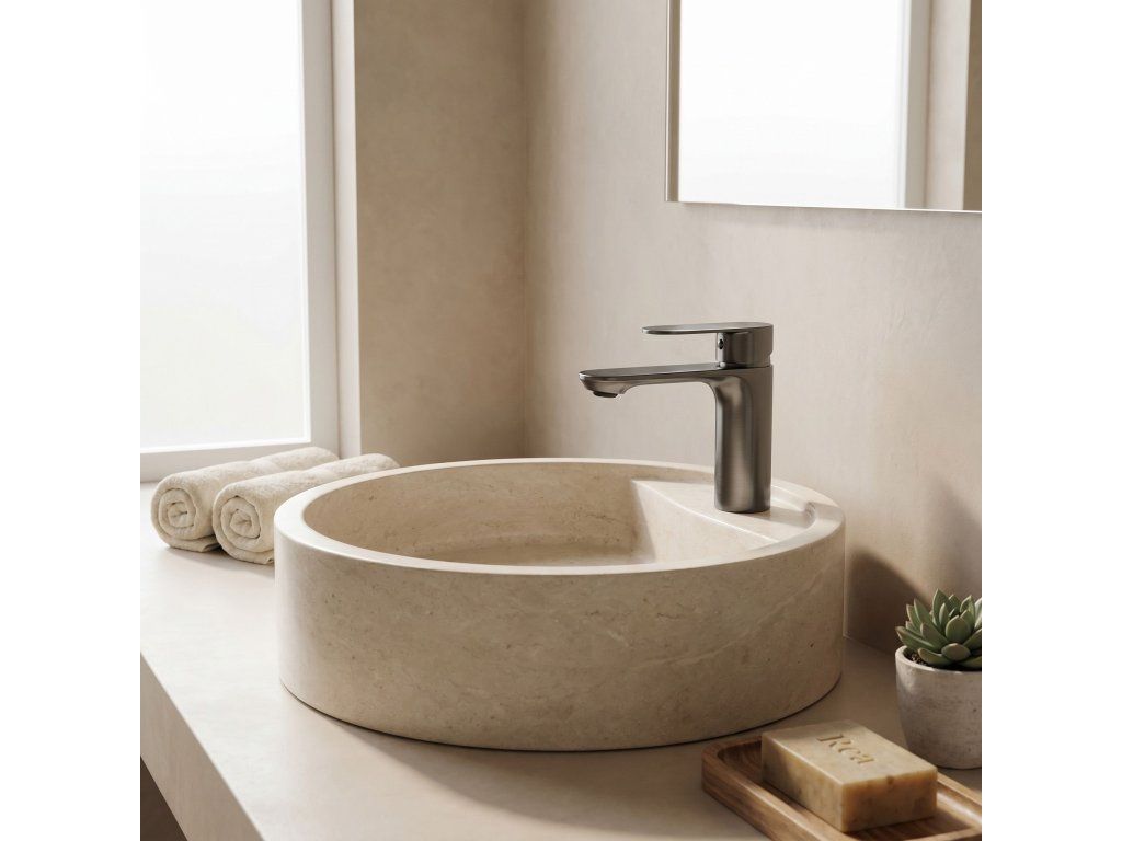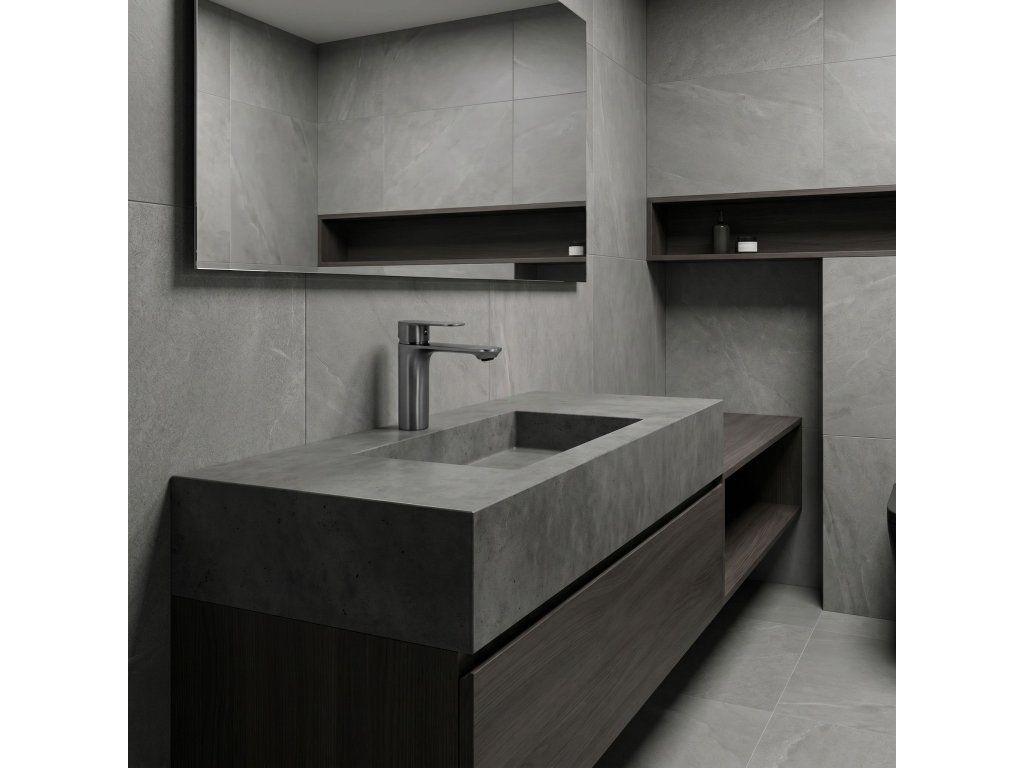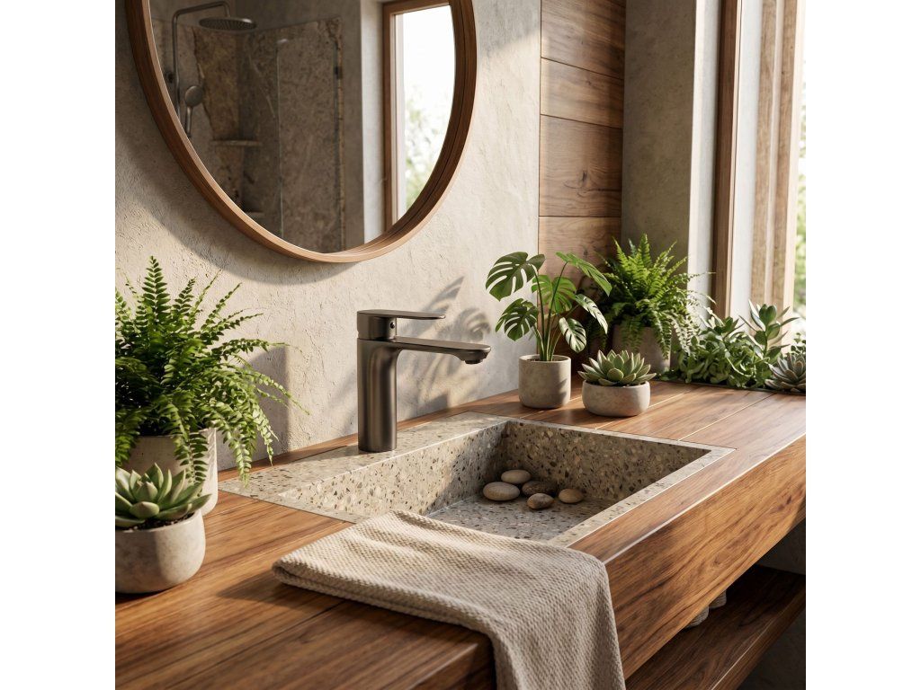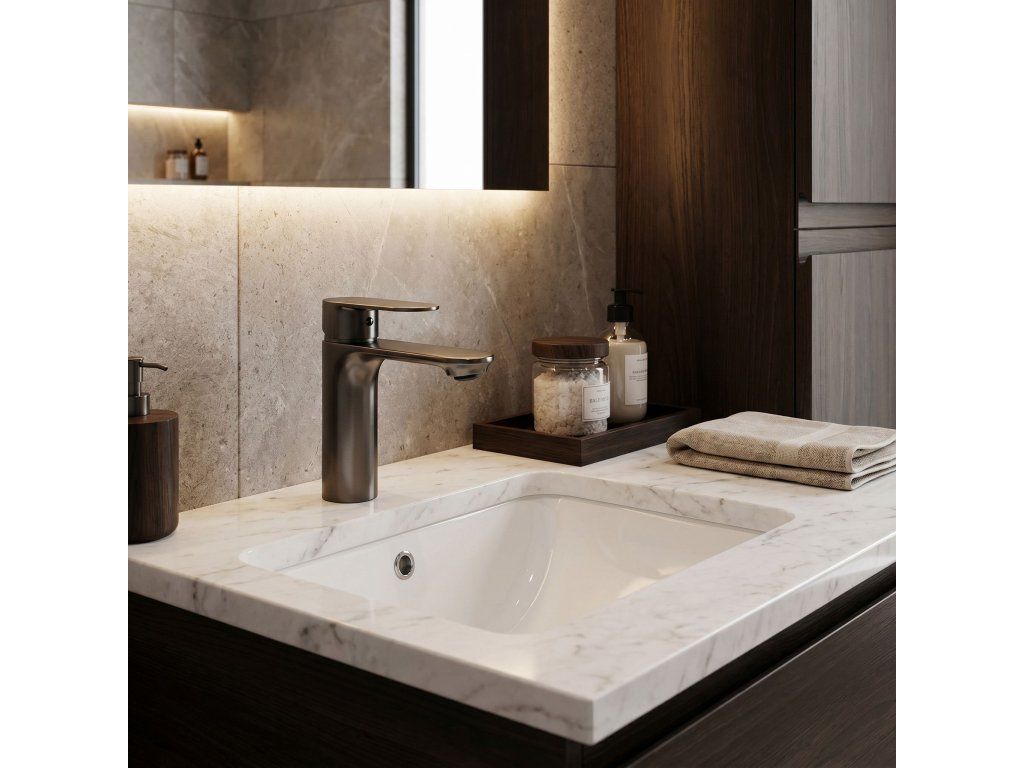 Umyvadlová baterie Drop v titanovém provedení (Titanium) je nabídkou pro ty, kteří v koupelně oceňují syrovou elegancie a moderní styl. Její geometrická forma a hluboký titanový povrch zajišťují, že baterie dokonale ladí s loftovými i minimalistickými interiéry a dodává jim výrazný charakter.Ušlechtilý titanový povrch – tmavý saténový odstín titanu tvoří skvělou alternativu ke klasické černé a chromu a dodává umyvadlové zóně luxusní vzhled.Technologie povlakování PVD – pokročilá metoda nanášení barvy zaručuje nejvyšší odolnost proti poškrábání, korozi a změnám barvy.Geometrický minimalistický design – přímé linie a válcové tělo série Drop podtrhují moderní estetiku.Keramická kartuše nejvyšší třídy – zajišťuje plynulou a přesnou regulaci proudu a teploty vody.Úspora vody – integrovaný perlátor provzdušňuje proud, což umožňuje nižší spotřebu vody při zachování plného výkonu.Odolná mosazná konstrukce – tělo z vysoce kvalitní mosazi zaručuje stabilitu a spolehlivost po dlouhá léta.Univerzální montáž – nízká konstrukce modelu Drop je ideální pro většinu zápustných umyvadel i modelů na desku s otvorem pro baterii.