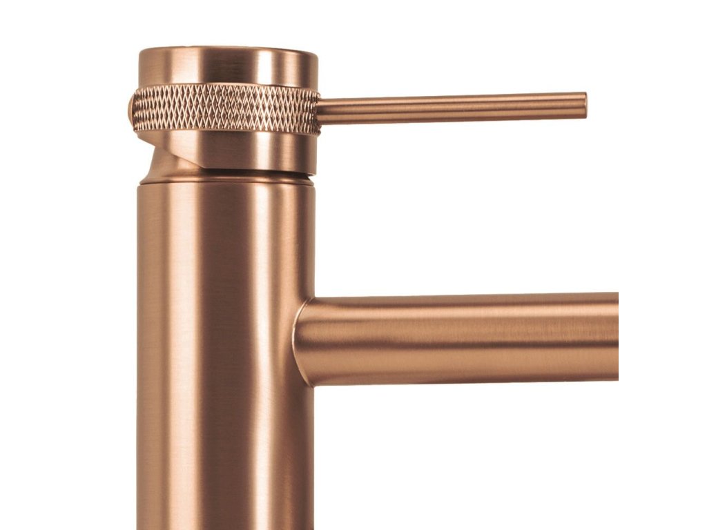 Vysoká umyvadlová baterie Lungo Grip v barvě kartáčované mědi je elegantní a funkční volbou pro moderní koupelny. Její štíhlý tvar a decentní měděná povrchová úprava dodávají interiéru luxusní charakter, zatímco ergonomická rukojeť usnadňuje regulaci průtoku vody.