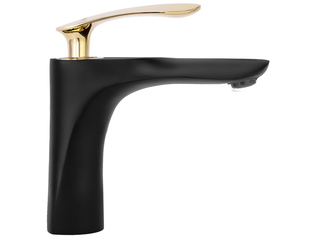 Moderní nízká umyvadlová baterie série Rea Orbit je vyrobena z vysoce kvalitní mosazi s úpravou v nevšedním černém matném provedení se zlatou pákou.