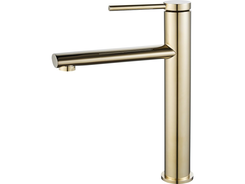 Moderní nízká umyvadlová baterie série Rea Oval je vyrobena z vysoce kvalitní mosazi s úpravou ve zlatém provedení.
