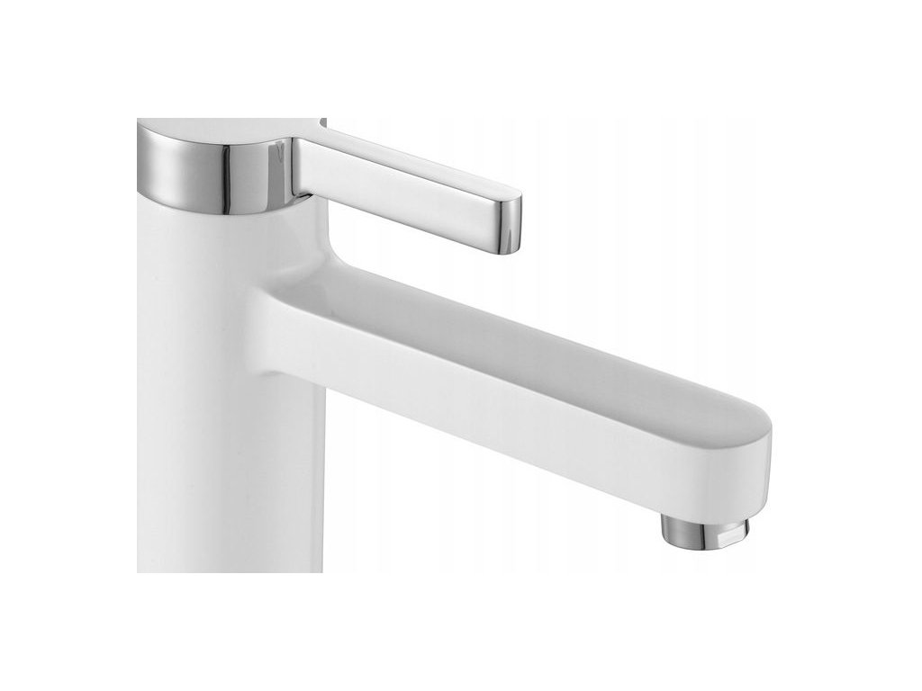 Moderní nízká umyvadlová baterie série Rea Polo je vyrobena z vysoce kvalitní mosazi s úpravou v bílém matném a chromovém provedení. Lakování baterie bylo provedeno celkem ve třech vrstvách.