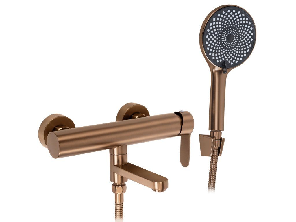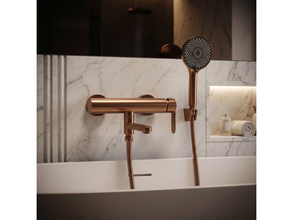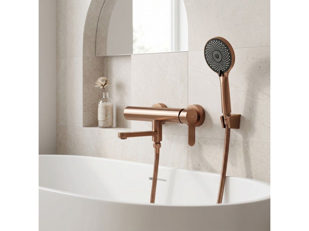 Nástěnná vanová baterie Arcos v barvě Brushed Copper je výrazný prvek armatury navržený pro montáž na omítku. Její jedinečný teplý odstín v kartáčovaném provedení představuje odvážnou alternativu ke standardním řešením a vnáší do koupelny moderní a zároveň útulný akcent.Povrchová úprava Brushed Copper (PVD) – pokročilá technologie nanášení povlaku PVD zaručuje nejvyšší odolnost proti oděru, korozi a změně barvy. Kartáčovaná struktura povrchu je také mimořádně praktická, účinně maskuje drobné usazeniny z vody a otisky prstů.Tělo z nerezové oceli – pevná základna z vysoce kvalitní nerezové oceli zajišťuje výjimečnou odolnost a trvanlivost při neustálém kontaktu s vodou. Tento materiál zaručuje stabilitu konstrukce a zachování nejvyšších hygienických standardů po celá léta.Sklopný výtok – inovativní řešení, které výrazně zvyšuje funkčnost. Možnost složení výtoku umožňuje získat více prostoru uvnitř vany při používání ruční sprchy.Keramická kartuše – uvnitř baterie je instalována keramická kartuše, která umožňuje plynulou a přesnou regulaci proudu a teploty vody a zajišťuje naprostou těsnost.Sprchová hlavice z ABS – přiložená sprchová sada obsahuje lehkou a ergonomickou sprchovou hlavici z odolného ABS plastu, odolného vůči změnám teploty a nárazům.Výběrem vanové baterie Arcos v barvě Brushed Copper investujete do produktu s jedinečným industriálním designem a pevnou konstrukcí. Kombinace nerezové oceli s odolným PVD povlakem a praktickými řešeními, jako je sklopný výtok, vytváří spolehlivou armaturu, která dodá vaší koupelnové zóně prestižní vzhled po dlouhou dobu.