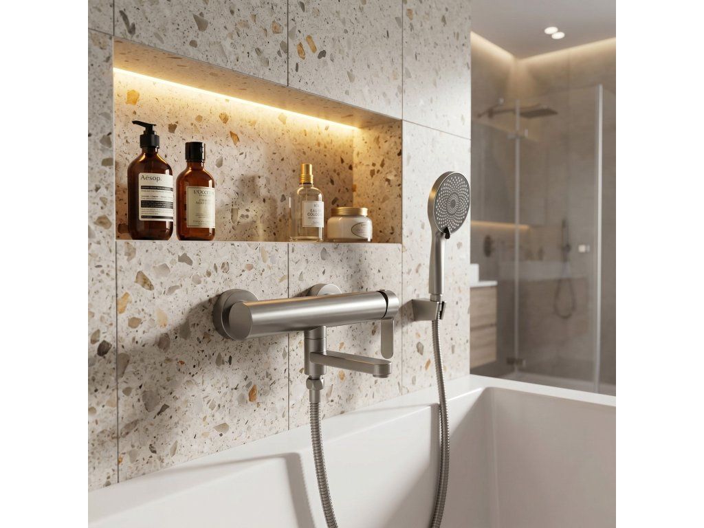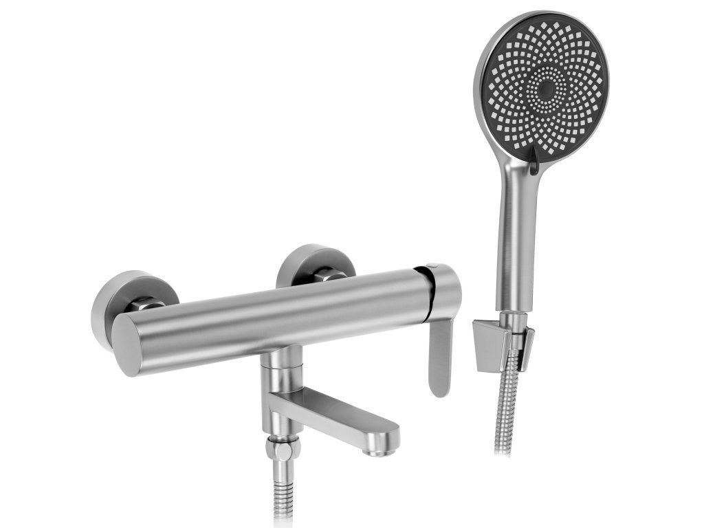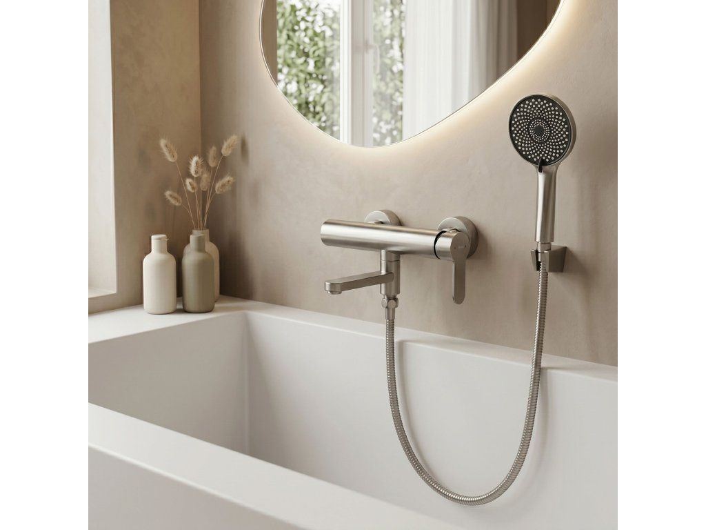 Nástěnná vanová baterie Arcos v barvě Brushed Nickel je moderní a neuvěřitelně stylové řešení, které kombinuje surový, industriální design s nejvyšší přesností zpracování. Saténový odstín je dokonalou volbou pro lidi, kteří hledají tlumenou eleganci, která přesahuje standardní chrom.Povrchová úprava Brushed Nickel (PVD) – pokročilá technologie PVD povlakování poskytuje armaturám výjimečnou tvrdost a odolnost proti poškrábání a korozi. Matná, kartáčovaná struktura je velmi praktická pro každodenní péči, protože účinně maskuje otisky prstů a skvrny od vody.Tělo z nerezové oceli – pevná základna vyrobená z vysoce kvalitní nerezové oceli zaručuje plnou odolnost proti dlouhodobému kontaktu s vodou a stabilitu celé konstrukce. Je to odolný a hygienicky naprosto bezpečný materiál.Sklopný výtok – funkce, která výrazně zvyšuje komfort používání. Možnost sklopení výtoku vám umožní získat více volného prostoru uvnitř vany při koupání nebo používání sprchy.Keramická kartuše – použití špičkové keramické kartuše se promítá do plynulého a přesného nastavení vhodné teploty a síly proudu vody.Sprchová hlavice z ABS – sada obsahuje lehkou a ergonomickou hlavici vyrobenou z odolného ABS plastu. Je odolná vůči nárazům a usazování vodního kamene, což zajišťuje pohodlný a rovnoměrný proud vody po dlouhou dobu.Výběrem nástěnné vanové baterie Arcos v barvě Brushed Nickel investujete do pokročilé technologie a moderní estetiky. Kombinace nerezové oceli s odolným PVD povlakem a praktickým sklopným výtokem dělá z tohoto produktu dokonalý doplněk každé současné koupelnové zóny.