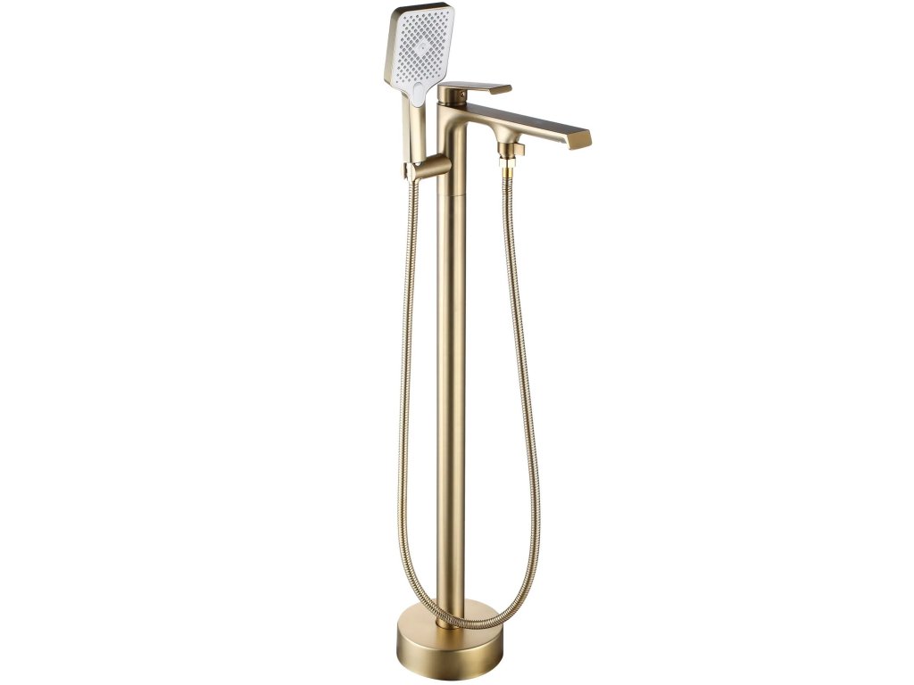 Moderní a velice designová volně stojící vanová baterie zaujme svým neobvyklým designem. Skvěle vyplní prostor koupelny. Výrobek je vyroben z vysoce kvalitní mosazi ve zlatém provedení. Baterie je velmi odolná a snadno se čistí.