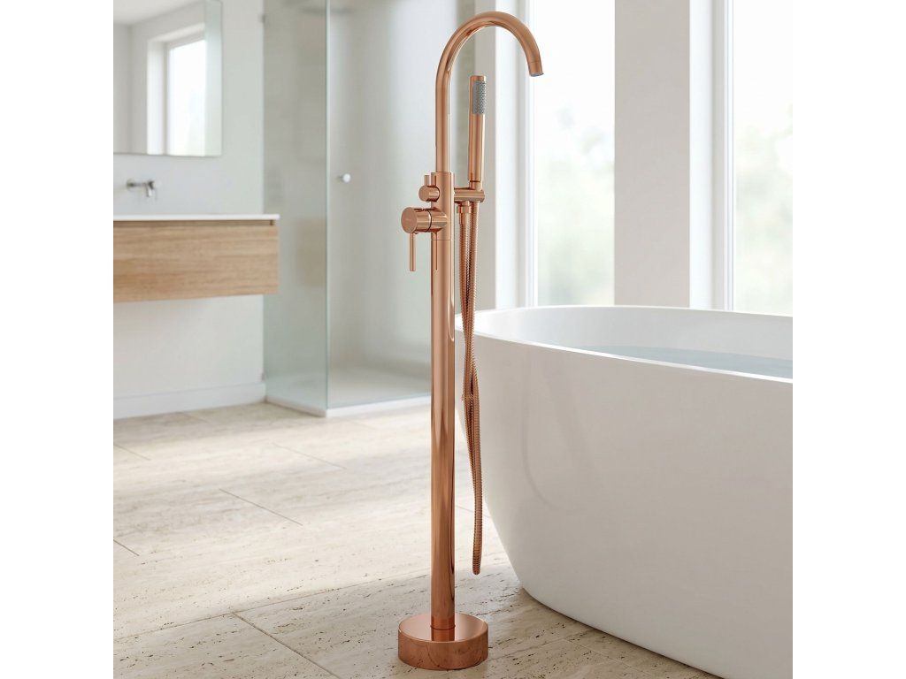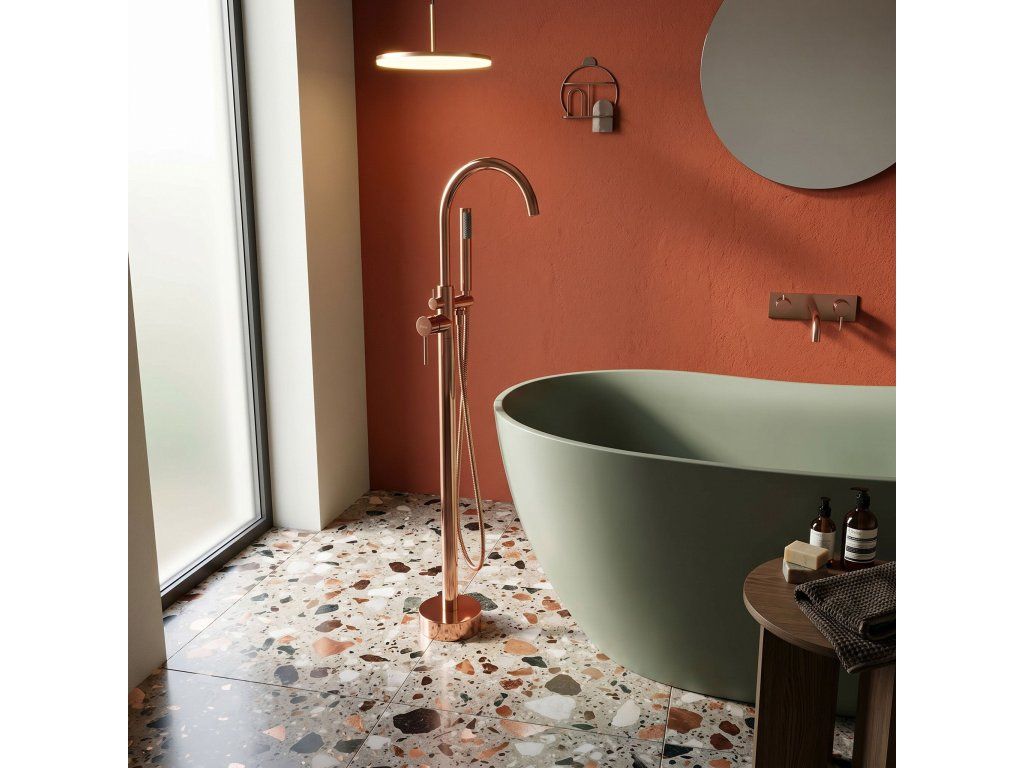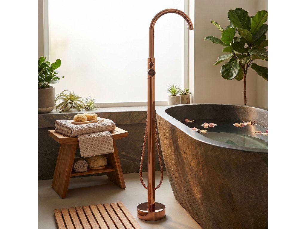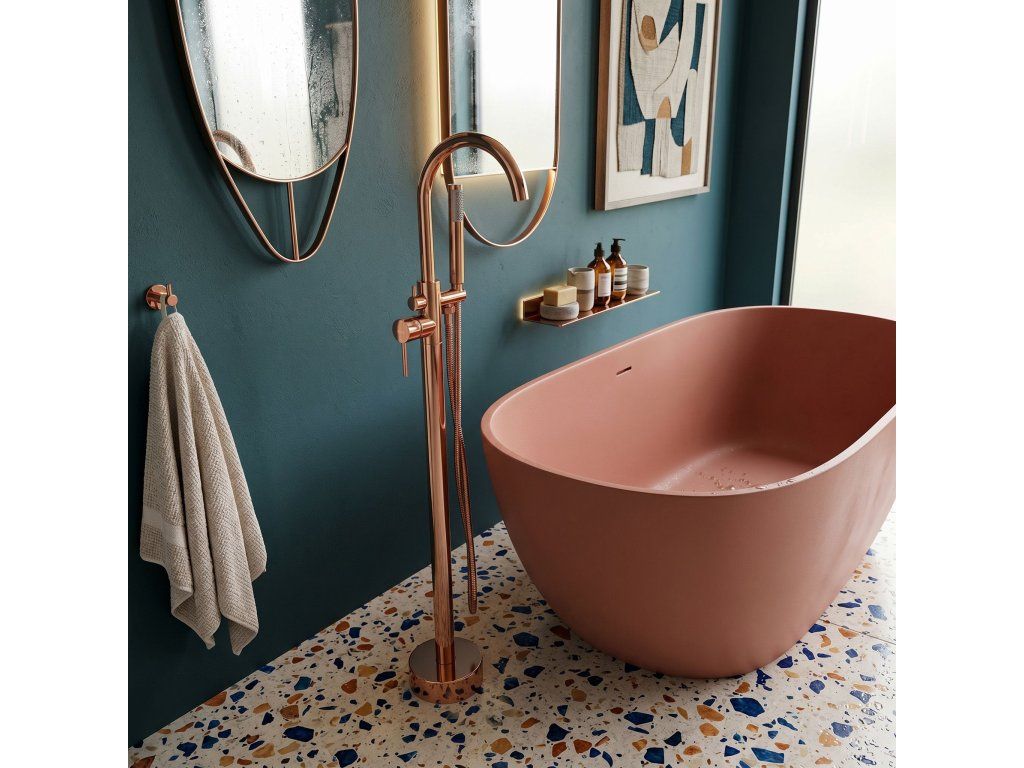 Volně stojící vanová baterie Lungo v magnetizující měděné barvě (Copper) je kvintesencí luxusu a moderního designu. Její štíhlá, vysoká silueta v kombinaci s teplým leskem mědi dodává každé volně stojící vaně prestižní vzhled.Ušlechtilý měděný povrch – intenzivní lesk v měděném odstínu vnáší do interiéru výjimečné teplo a šperkový jas.Technologie Electroplating – pokročilá metoda galvanického pokovování zaručuje dokonale hladký povrch, jednotnou barvu a ochranu proti korozi.Minimalistická linie Lungo – válcové tělo s čistou geometrickou formou podtrhuje moderní charakter a usnadňuje údržbu.Plná koupelová funkčnost – model je vybaven intuitivním přepínačem mezi výtokem a ergonomickou sprchovou hlavicí.Komfortní ruční sprcha – součástí sady je hlavice na flexibilní hadici v odpovídající barvě.Spolehlivé komponenty – srdcem baterie je špičková keramická kartuše pro plynulou regulaci teploty a proudu vody.Mosazná konstrukce Premium – tělo z masivní mosazi zaručuje stabilitu podlahové montáže a mechanickou odolnost.