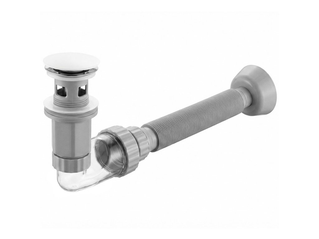 Zvolte funkční řešení do své koupelny díky odtokové sadě se sifonem a zátkou Click-Clack. Tento produkt spojuje estetické provedení s inovativními servisními prvky. Konstrukce byla navržena tak, aby co nejvíce usnadnila montáž i průběžné čištění odpadu.Univerzální použití – sada je přizpůsobena k montáži jak s umyvadly vybavenými přepadem, tak s modely bez přepadu, což z ní činí všestrannou volbu do každé koupelny.Zátka Click-Clack s vyjímatelnou vložkou – mechanismus typu “push-open” umožňuje zavírání a otevírání odpadu jediným stisknutím. Klíčovou výhodou je možnost úplného vyjmutí horní vložky zátky, což umožňuje bleskově odstranit vlasy a usazeniny “shora”, bez nutnosti demontáže sifonu pod umyvadlem.Průhledné inspekční koleno – spodní prvek sifonu je vyroben z transparentního materiálu. To umožňuje rychlou kontrolu průchodnosti a usnadňuje nalezení cenných drobností, jako jsou ztracené šperky, které do něj omylem spadnou. Úhlová konstrukce 90° navíc šetří místo ve skříňce.Blokace nepříjemných pachů – konstrukce sifonu účinně zadržuje vodu a vytváří bariéru, která zabraňuje pronikání nepříjemných pachů z kanalizace do místnosti.Flexibilní harmoniková trubka – odpad má nastavitelnou délku s možností prodloužení až do 1 metru. Ohebná konstrukce usnadňuje připojení umyvadla ke kanalizaci v netypických uspořádáních a eliminuje problém montážních posunů.Odolné materiály – zátka je opatřena trvanlivou povrchovou úpravou, odolnou proti korozi a snadnou na čištění. Tělo sifonu i trubka jsou vyrobeny z odolného plastu a gumová těsnění zaručují úplnou těsnost spojů.Díky vyjímatelnému košíčku zátky a průhledné konstrukci zabere běžná údržba umyvadlového sifonu Flow jen chvilku a univerzální přípojky pasují na standardní umyvadla.