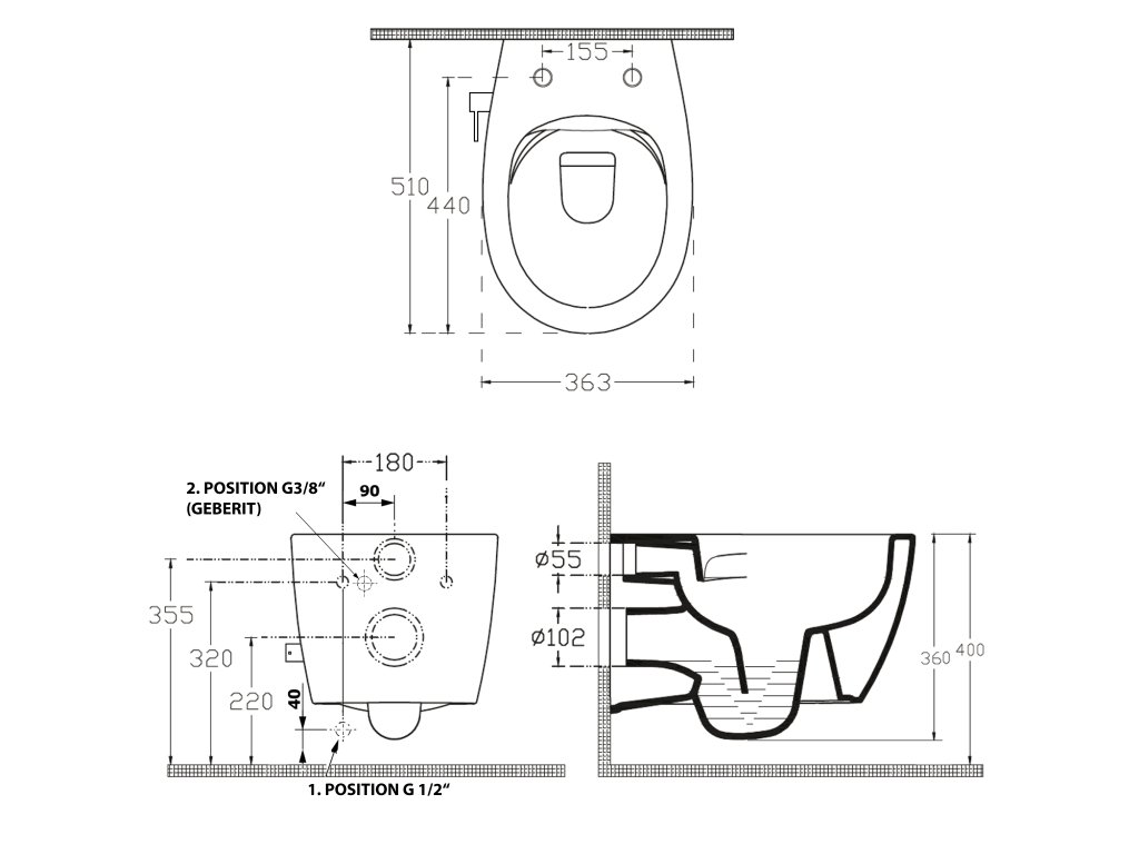 SENTIMENTI CLEANWASH závěsná WC mísa, integrovaný ventil a bidet. sprška, Rimless, 36x51cm, bílá