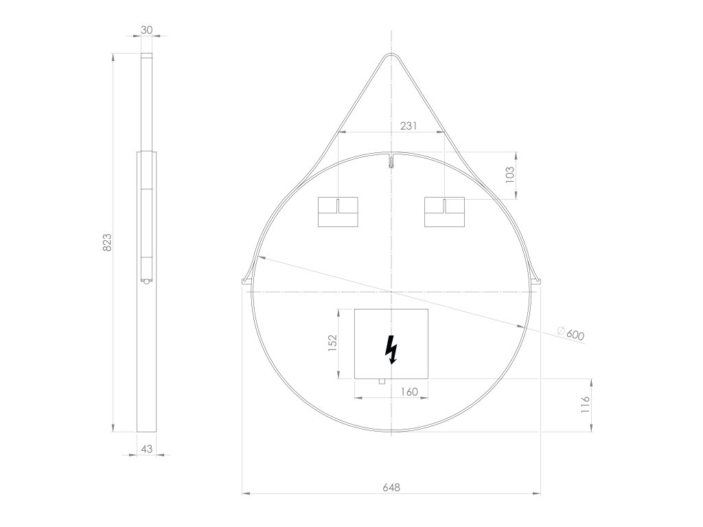 ORBITER kulaté zrcadlo s LED osvětlením ø 60cm, kožený pásek, černá mat