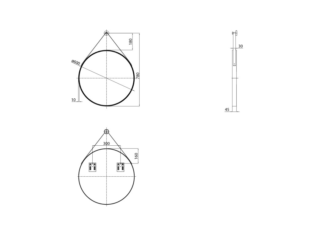 STAGO kulaté zrcadlo ø 60cm, kožený pásek, černá mat